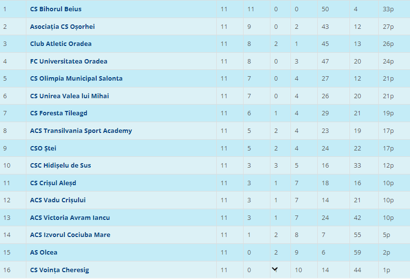 Etapa viitoare (2-3 noiembrie): sâmbătă, Olimpia Salonta – FC Universitatea Oradea (ora 11:00), ACS Oșorhei – Club Atletic Oradea (ora 11:00), Unirea Valea lui Mihai – CS Bihorul Beiuș (ora 14:00); duminică, CSO Ștei – Foresta Tileagd, Victoria Avram Iancu – Crișul Aleșd, AS Olcea – Voința Cheresig, CSC Hidișelu de Sus – Transilvania Sport Academy, ACS Vadu Crișului – Izvorul Cociuba Mare (toate de la ora 14:00).