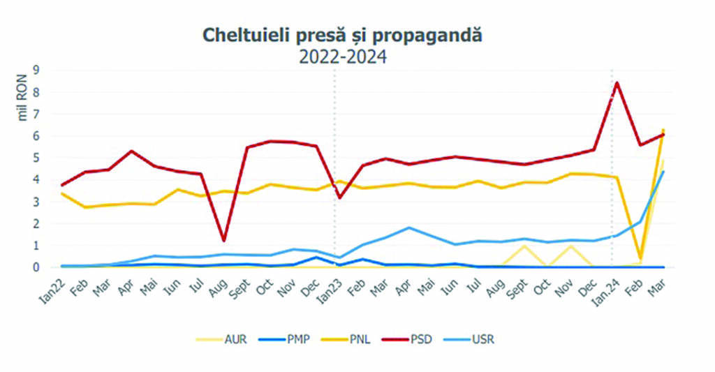 Partidele au atins cele mai mari valori ale cheltuielilor de când se măsoară aceste date. PSD a cheltuit în ianuarie 2024 8,4 milioane de lei, depășind recordurile anterioare de la finalul lui 2021 (7,2 milioane de lei). PNL și AUR au reușit aceste performanțe în martie 2024, cu 6,2 milioane de lei, respectiv 4,8 milioane de lei. USR a cheltuit, de asemenea, cel mai mult comparativ cu istoria partidului privind subvențiile – 4,3 milioane de lei în martie.