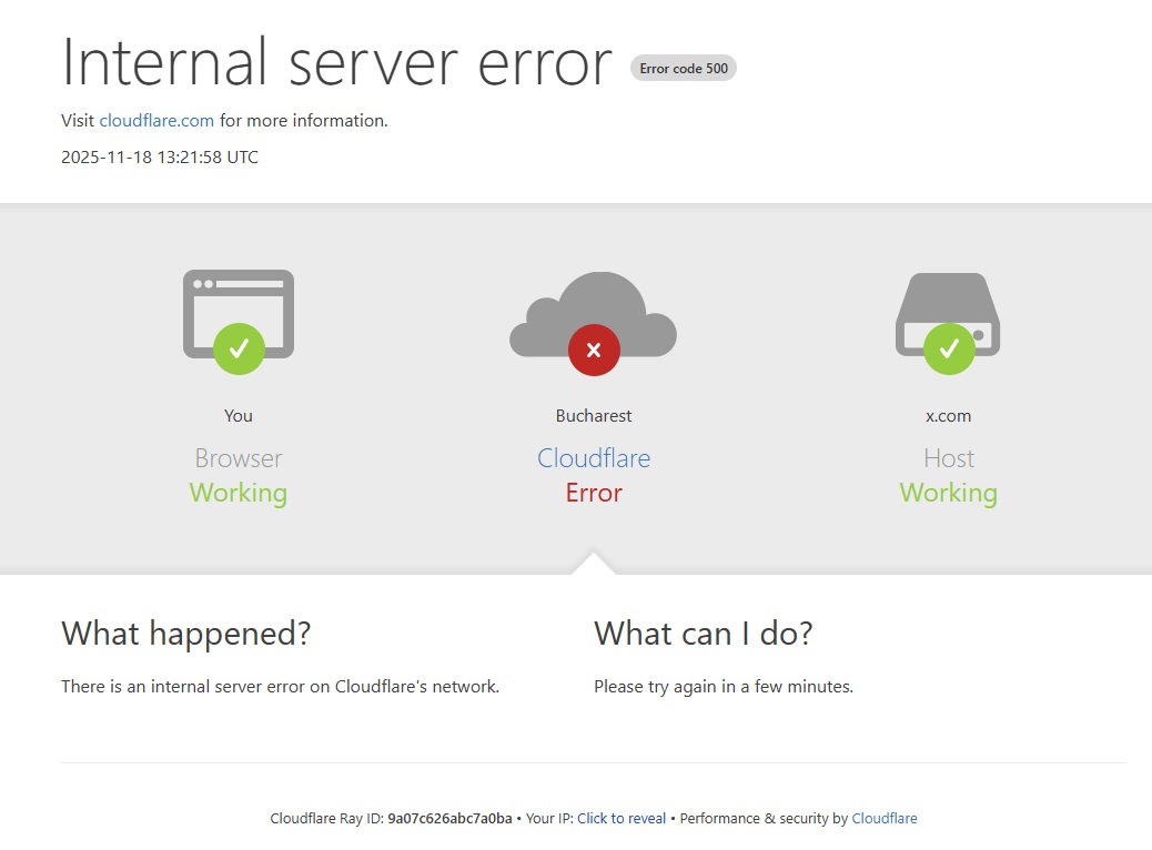 Utilizatorii afectați au văzut un mesaj care indica existența unei „erori interne a serverului pe rețeaua Cloudflare”. Mesajul le cerea utilizatorilor să „încerce din nou peste câteva minute”.