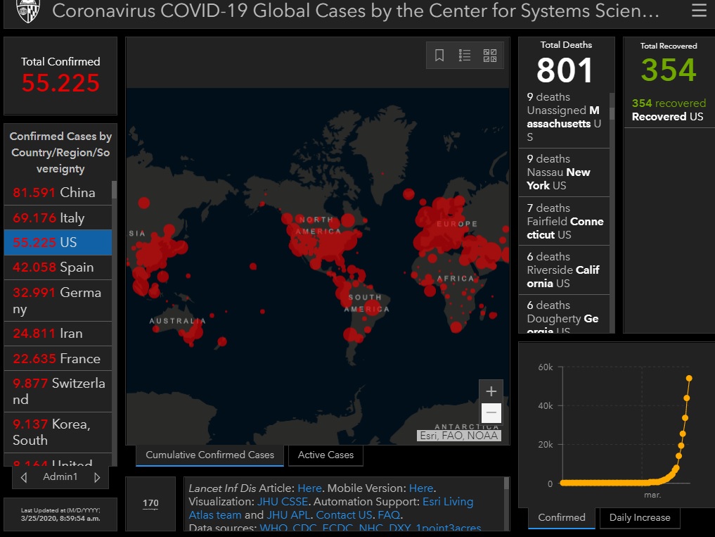 Până miercuri dimineață, potrivit centralizărilor făcute de Universitatea Johns Hopkins, în SUA sunt 55.225 de cazuri, aceasta fiind pe locul 3 mondial, primul și al doilea fiind ocupate de China (81.591), respectiv Italia (69.176).