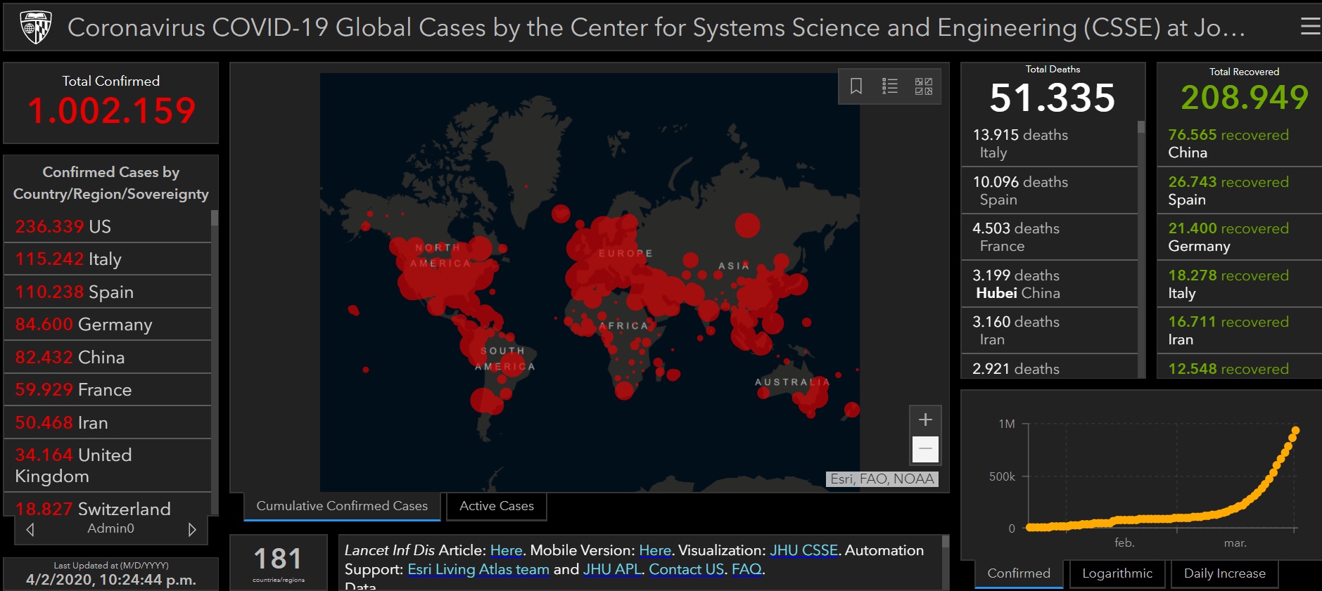 Peste 50.000 de persoane au decedat până în acest moment de coronavirus, iar peste 208.000 au fost declarate vindecate. SUA deține poziția de lider în contextul infectării cetățenilor cu virusul COVID-19 (236.339 cazuri), și este urmată de Italia cu 115.242 cazuri, respectiv Spania cu 110.238 de cazuri. Totodată în cazul deceselor, cel mai mare număr înregistrat aparține Italiei, cu 13.915 persoane, urmată de Spania cu 10.096 decese.