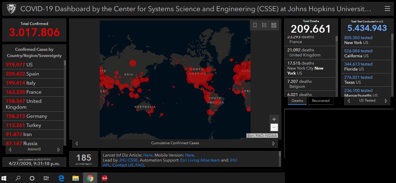 Pragul de trei milioane de infectări cu virusul Sars-Cov-2 a fost depășit luni seara, fiind înregistrate 3.017.806 cazuri, potrivit hărții interactive, realizată de Universitatea Johns Hokpins. Până în acest moment 209.661 persoane infectate cu COVID-19 și-au pierdut viața. Cele mai multe cazuri de coronavirus au fost raportate în SUA, care în acest moment înregistrează aproape un milion de cazuri (979.077). În Europa, Spania deține cel mai mare număr de cazuri confirmate 229.422 și este urmată de Italia (199.414), Franța (162.220), Marea Britanie (158.347), Germania (158.213) și Turcia (112.261).
