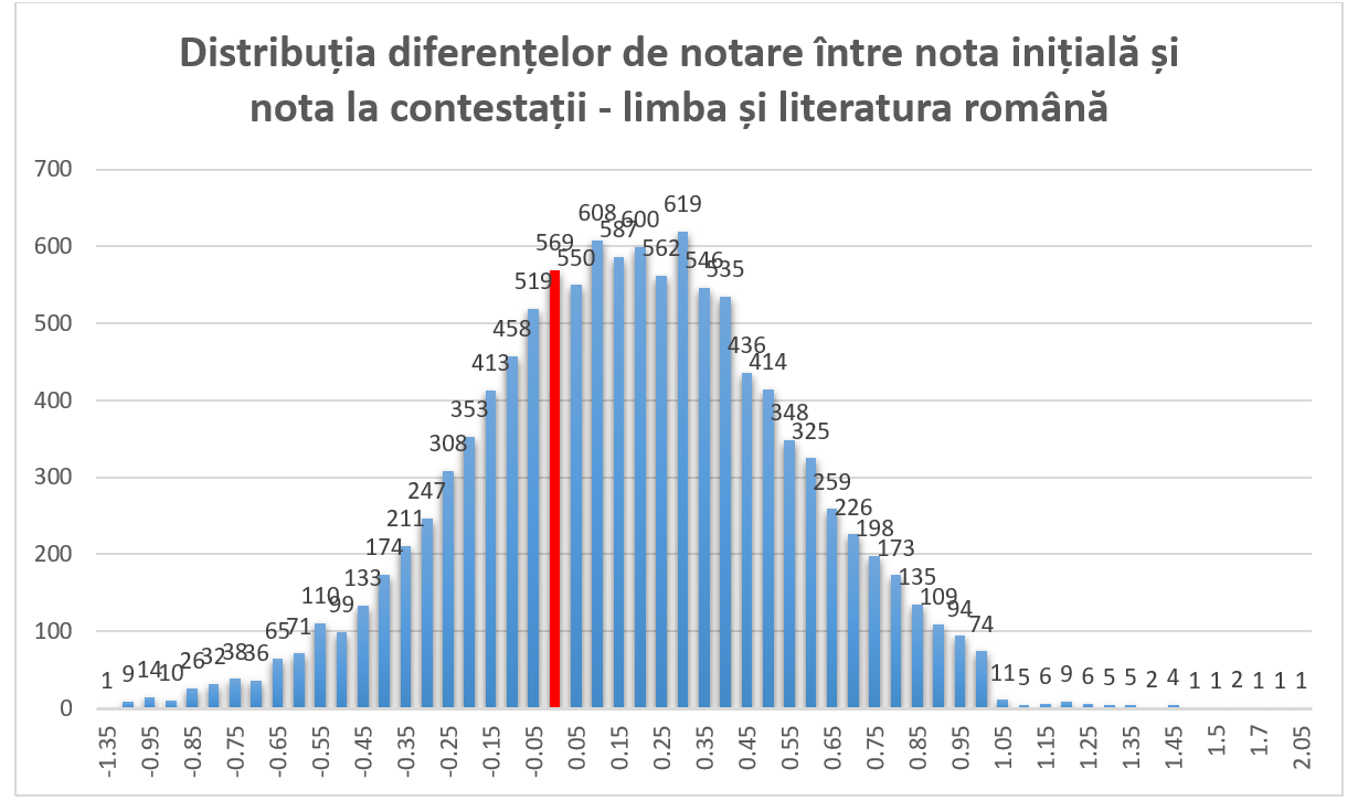 La proba de Limba și literatura română, în cazul a 78,75% dintre lucrările reevaluate, diferența între nota inițială și nota obținută în urma reevaluării a fost sub 0,5 puncte (în plus sau în minus). Dintre acestea, pentru 569 dintre lucrări nota inițială nu a fost modificată.