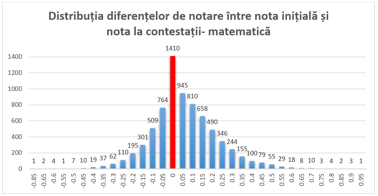 La Matematică, în cazul a 98,84% dintre lucrările reevaluate, diferența între nota inițială și cea obținută în urma reevaluării a fost sub 0,5 puncte (în plus sau în minus). Dintre acestea, pentru 1.410 dintre lucrări nota inițială nu a fost modificată.