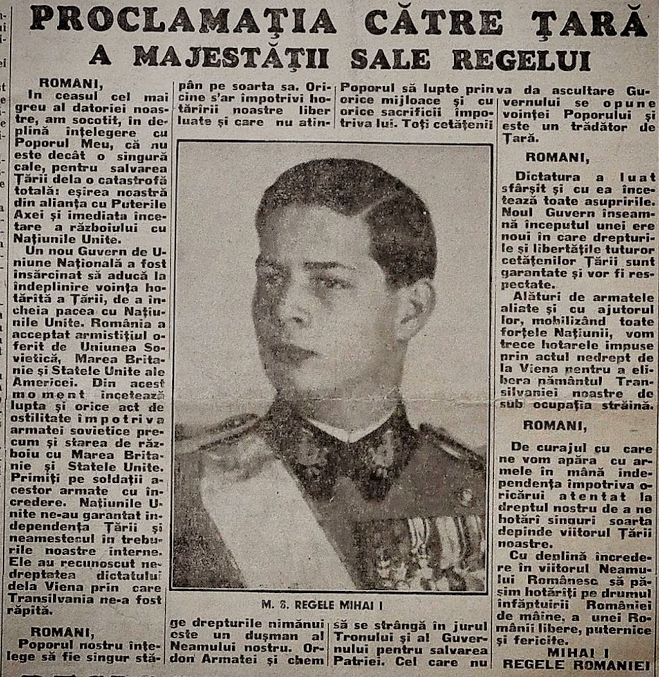 Pe 22 August 1944, ora 22:30, prin Proclamaţia către ţară, regele Mihai anunţa „ieşirea noastră din alianţa cu puterile Axei şi imediata încetare a războiului cu Naţiunile Unite”. Hotărârea a scurtat cu şase luni cel de-al Doilea Război Mondial.