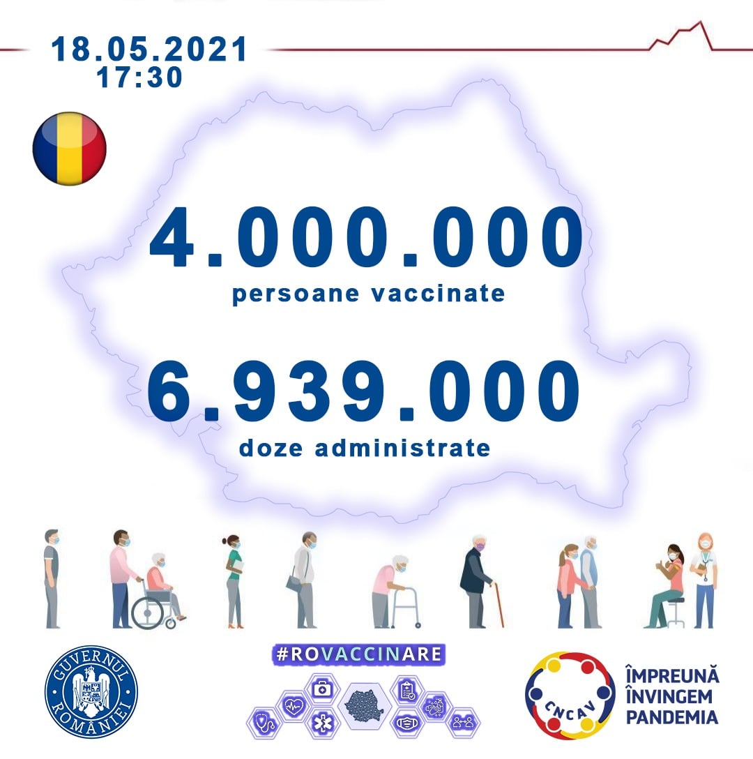 Potrivit datelor prezentate de reprezentanții Campaniei de Vaccinare, până marți, 18 mai au fost efectuate 6.939.000 doze de ser anti-COVID, iar