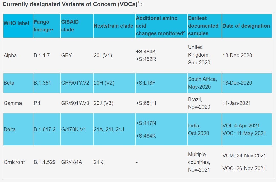 Lista oficială a OMS a variantelelor SARS-CoV-2 conține în prezent cinci „variante care determină îngrijorare” – Alpha, Beta, Gamma, Delta și noua variantă Omicron – precum și două „variante de interes” – Lambda și Mu.