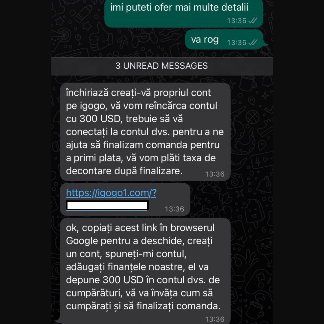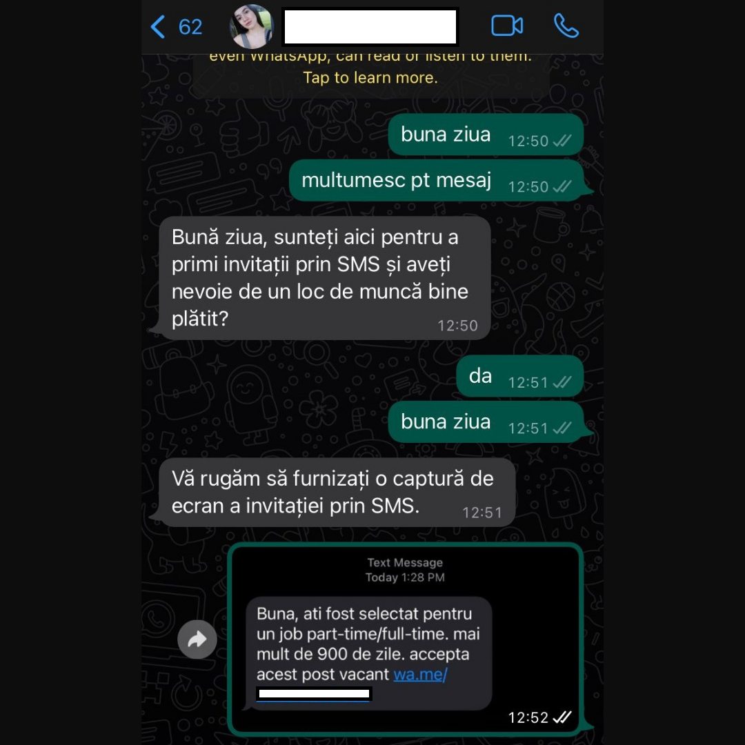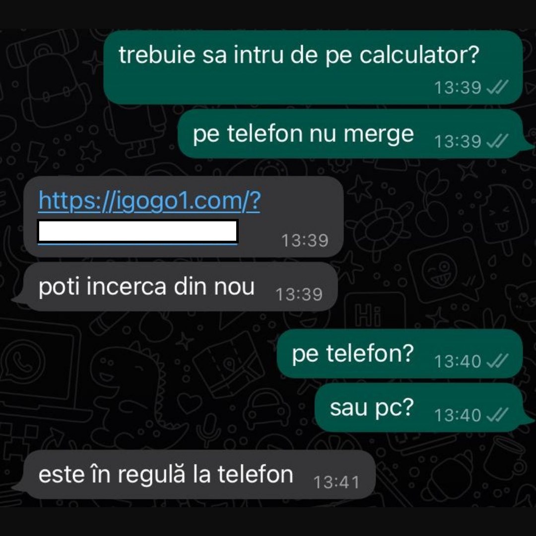 Mesajul primit are și un link care, odată accesat, redirecționează utilizatorul către aplicația de mesagerie WhatsApp și deschide o conversație cu infractorii cibernetici din spatele acelui contact, susțin specialiștii.