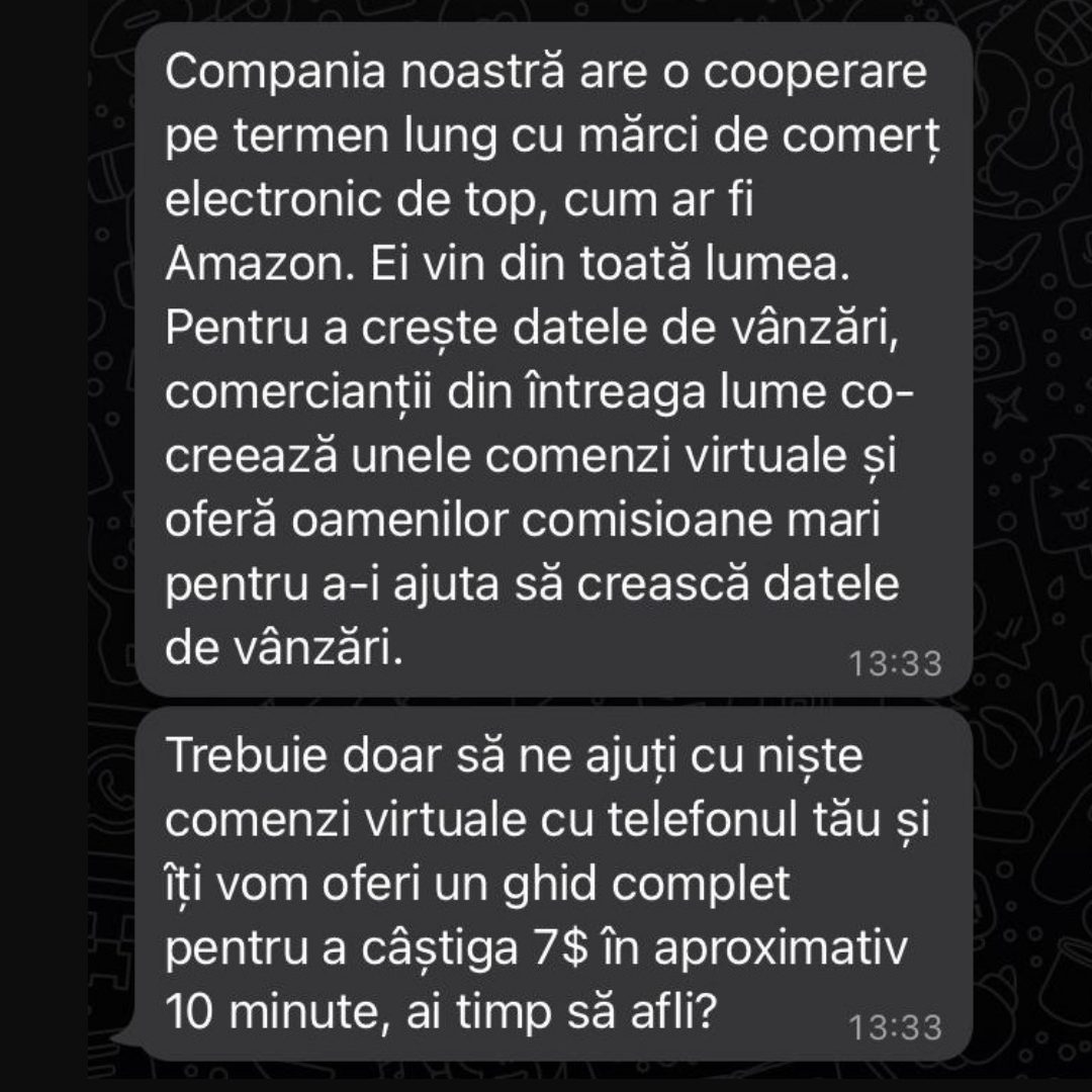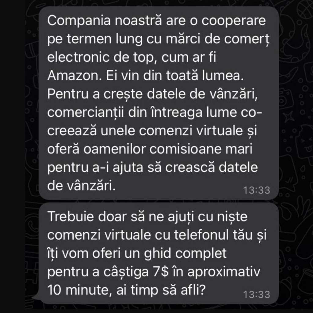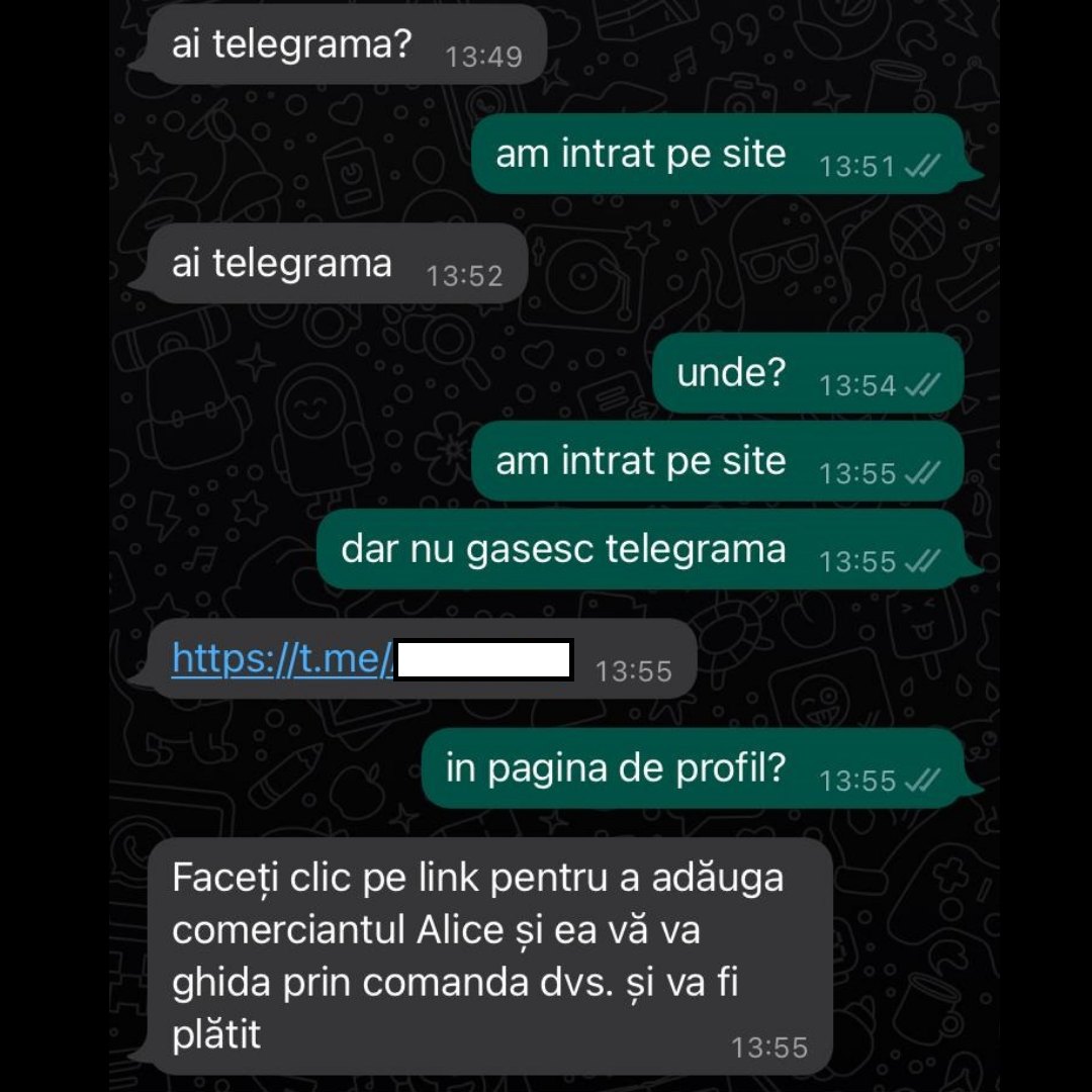 Mesajul primit are și un link care, odată accesat, redirecționează utilizatorul către aplicația de mesagerie WhatsApp și deschide o conversație cu infractorii cibernetici din spatele acelui contact, susțin specialiștii.