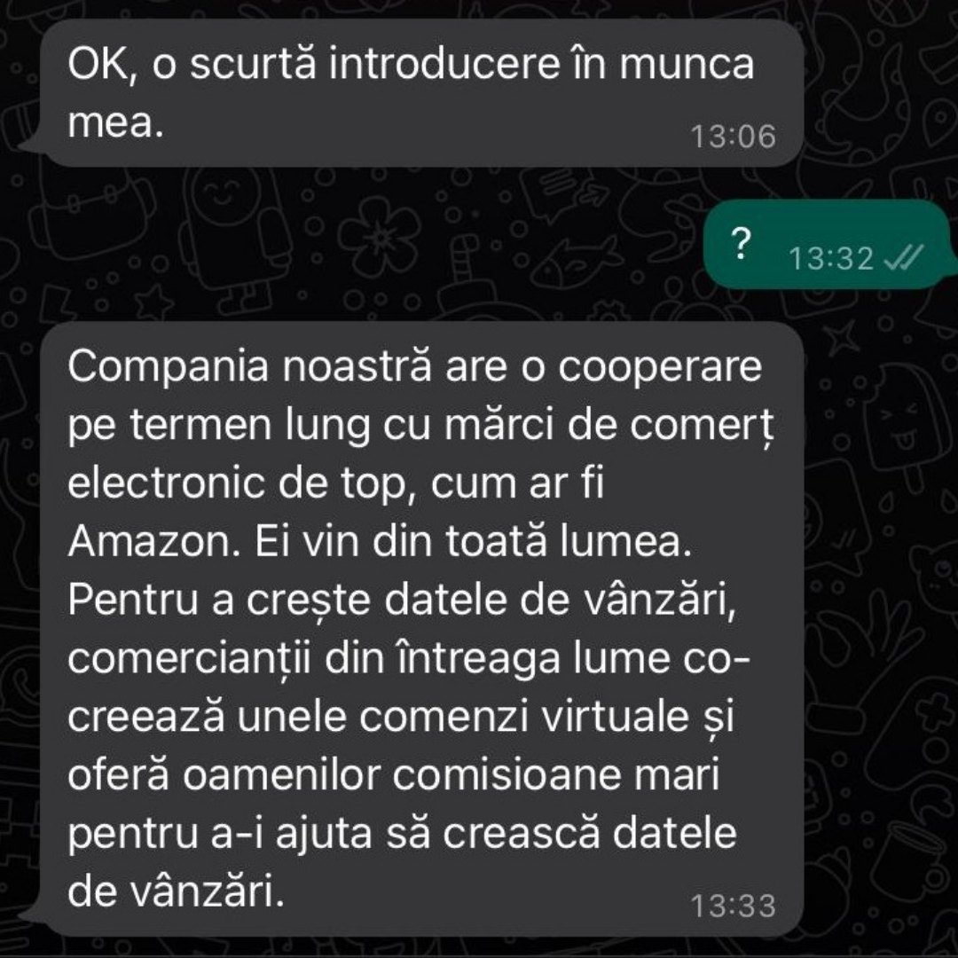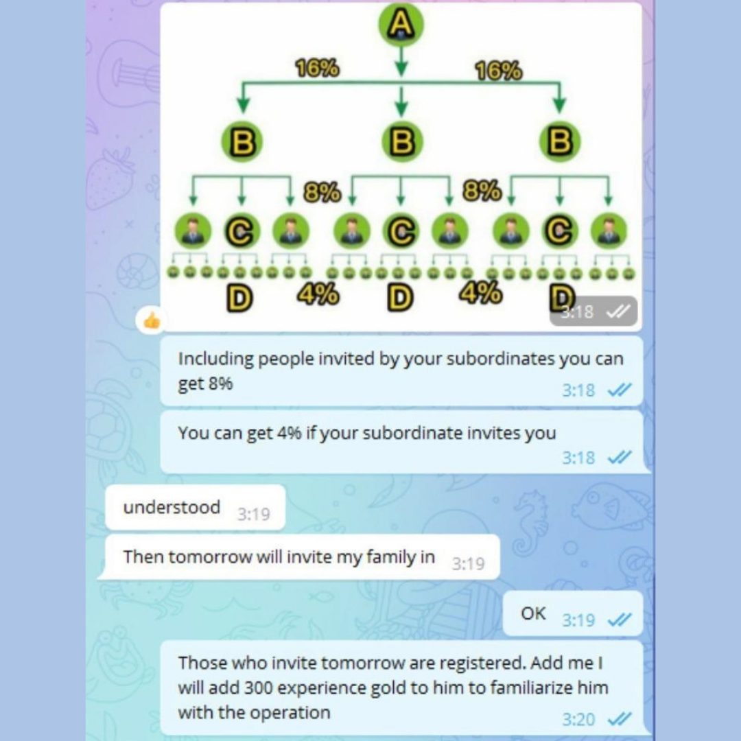 „În urma conversației avute, aflăm că putem câștiga bani rapid prin obținerea de comisioane din menite să <crească datele de vânzări> ale unor comercianți cunoscuți la nivel internațional. Potențiala victimă este invitată apoi să-și facă un cont pe un site, unde trebuie să furnizeze date cu caracter personal, apoi este redirecționată către un canal de Telegram, unde i explică pas cu pas ce trebuie să facă. Canalul de Telegram are deja un număr impresionant de urmăritori (aproape 50.000). În cele din urmă, din conversațiile existente pe acest canal de Telegram se observă promovarea unui sistem piramidal de câștig bazat pe invitarea unor noi <clienți>, la care se adaugă ulterior o componentă de investiții în criptomonedă. Astfel, pe termen mediu există pericolul ca atacatorii să extragă nu doar de date personale, ci și date financiar-bancare de la utilizatori”, arată DNSC.