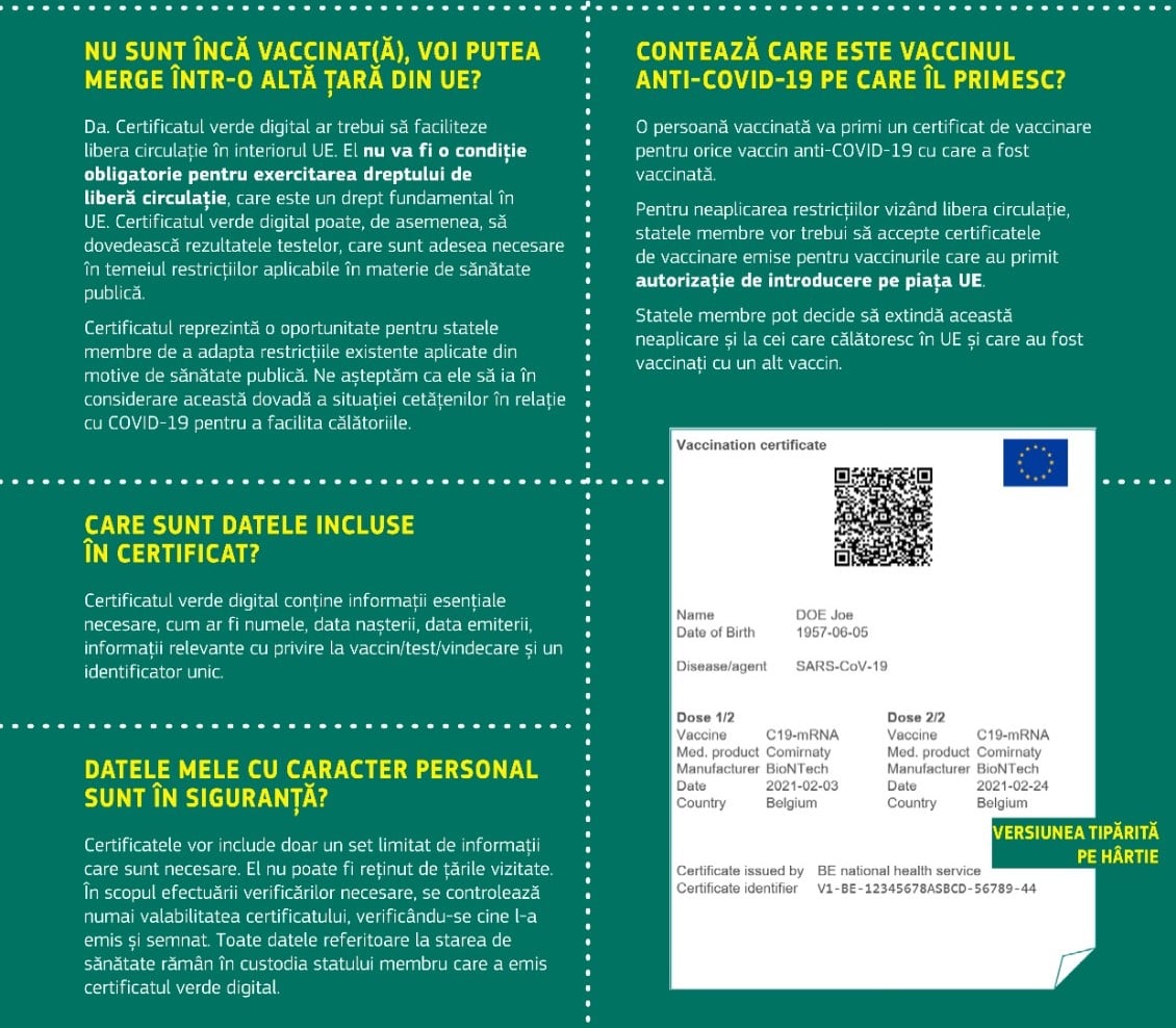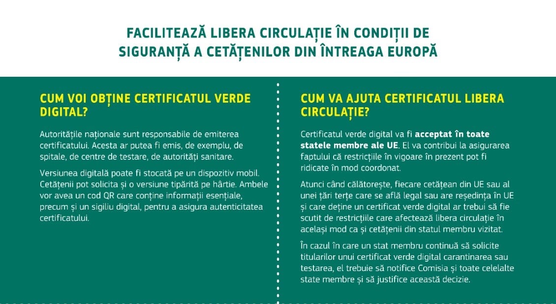 Adeverința electronică verde va constitui dovada că deținătorul a fost vaccinat împotriva COVID-19, a primit un rezultat negativ la testul de depistare a infecției cu virusul SARS-CoV-2 sau s-a vindecat de COVID-19.