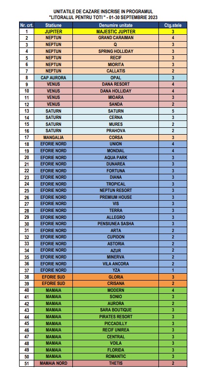 Programul „Litoralul pentru toți”, a ajuns la ediția cu numărul 42, se derulează în perioada 1 – 30 septembrie 2023 și se adresează tuturor turiștilor care vor să petreacă un sejur pe litoralul autohton în extra-sezon. Până în prezent s-au înscris în program 51 de hoteluri din toate stațiunile de pe litoral, care pun la dispoziția turiștilor un număr de aproximativ 5.000 de locuri de cazare pe noapte.