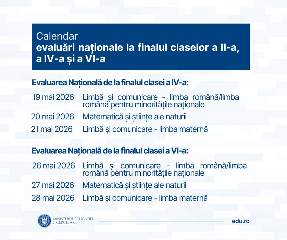 Calendarul Evaluărilor Naționale de la finalul claselor a II-a, a IV-a și a VI-a