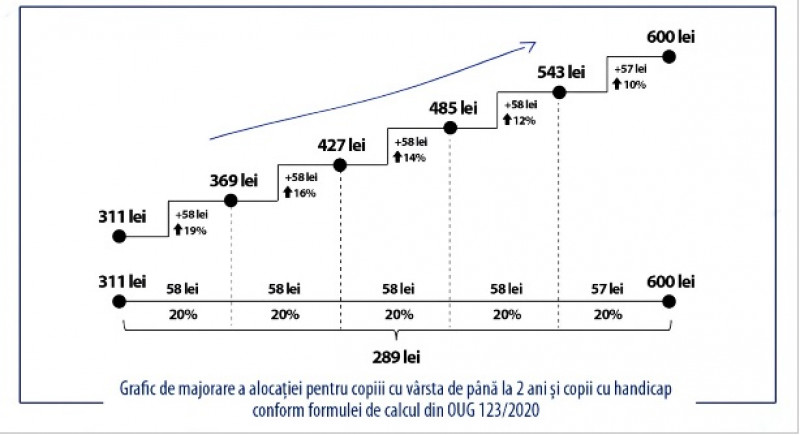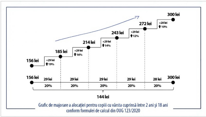 Potrivit Ordonanței de urgență a Guvernului nr. 123/2020 pentru modificarea art. 3 din Legea nr. 61/1993 privind alocaţia de stat pentru copii, majorarea alocației pentru copii până la nivelul de 600 lei pentru copiii cu vârsta de până la 2 ani și copiii cu handicap, respectiv până la 300 lei pentru copiii cu vârsta cuprinsă între 2 ani şi 18 ani, se realizează etapizat prin majorarea cu 20 de puncte procentuale, aplicate sumei rezultate din diferenţa dintre cuantumul de 600 lei, respectiv 300 lei, şi cuantumul acordat anterior, în luna iulie 2020.