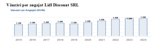 Topul este completat de Lidl Discount SRL, cu 12.735 de salariați. Compania a raportat cea mai mare cifră de afaceri din clasament, de 24 miliarde lei, și un profit net de 1,2 miliarde lei. Indicatorii de eficiență sunt cei mai ridicați din top: 1,9 milioane lei vânzări per angajat și 96.000 lei profit per angajat. Lidl este deținut integral de un grup german.