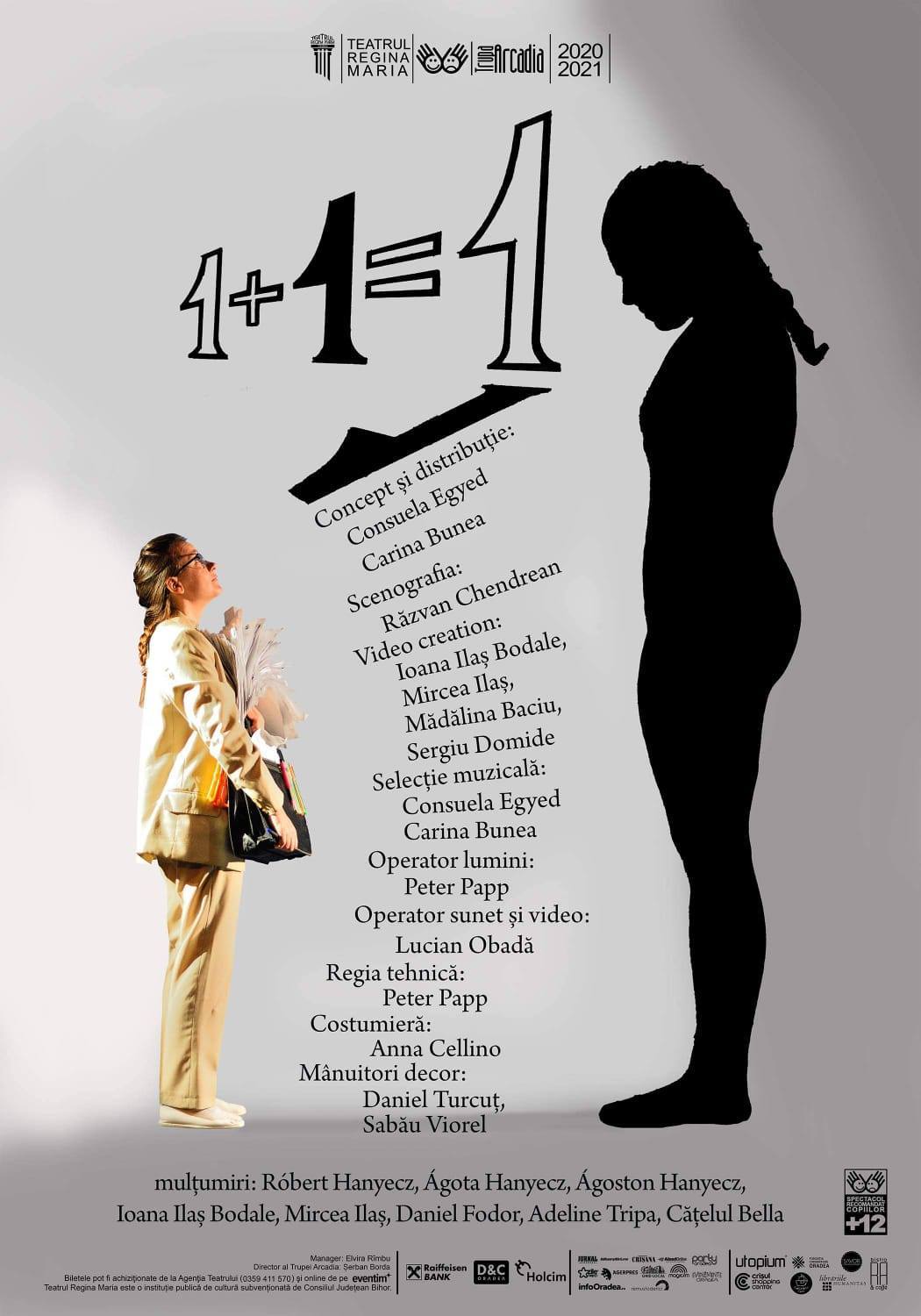 Ideea spectacolului a venit în urma unei provocări la care și-au dorit să răspundă actrițele Consuela Egyed și Carina Bunea: „Ce putem crea cu o hârtie albă? De aici a pornit ideea de umbre și de a realiza o poveste care să susțină un act teatral. Așa am creat povestea unei tinere care se pierde pe ea însăşi și se regăsește prin prisma unui vis revelator”, transmit cele două protagoniste. „Spectacolul, care reprezintă visul fetei, este ca un fel de călătorie inițiatică. O călătorie în care tânăra e condusă de propria ei umbră. E o călătorie metaforică spre copilul interior, pe care de multe ori îl ignorăm”, au mai transmis actrițele. Spectacolul „1+1=1” are o durată de 45 de minute și se joacă în Sala Arcadia, unde numărul de locuri este limitat la 60 de persoane.