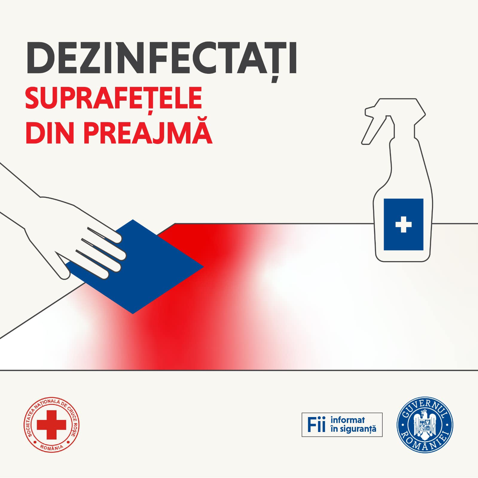 ❗️Dezinfectați frecvent, cu soluție pe bază de alcool sau clor, suprafețele cu care intrați în contact, atât acasă cât și la locul de muncă.