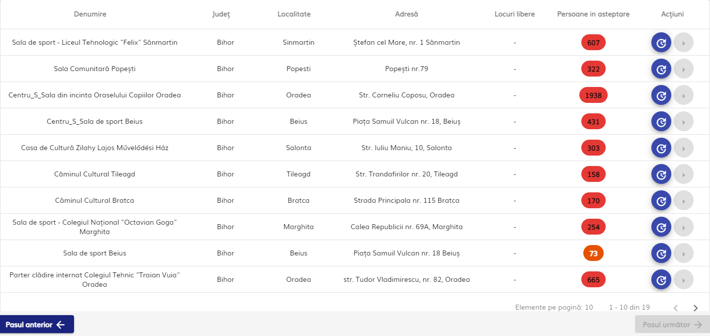 Momentan, în județul Bihor nu sunt locuri disponibile la niciunul dintre cele 19 centre de vaccinare. Bihorenii se pot înscrie însă pe listele de așteptare aferente fiecărui centru. Până sâmbătă la orele prânzului, pe listele de așteptare din județ erau înscriși peste 14.000 de bihoreni.