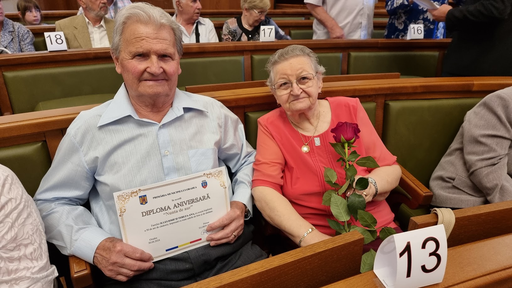 Viceprimarul Marcel Dragoș a acordat fiecărei perechi o diplomă de recunoștință și un trandafir. Acesta a afirmat: „Acum 5 ani, am trăit aceleași emoții alături de părinții mei care și-au sărbătorit nunta de aur chiar aici, în sala festivă a Primăriei Oradea. Știu ce înseamnă o familie și vă mărturisesc că mă bucur să vă văd atât de mulți împreună. Recent, am împlinit și eu 30 de ani de căsătorie și am sărbătorit nunta de argint. Așadar, cred sincer că într-o societate, familia este veriga cea mai importantă. Atunci când lucrurile merg bine într-o familie, ele se răsfrâng și asupra societății, iar ca adulți ducem mai departe ceea ce vedem mai bun în sânul familiilor noastre. Vă mulțumesc tuturor și vă doresc sărbători fericite!”