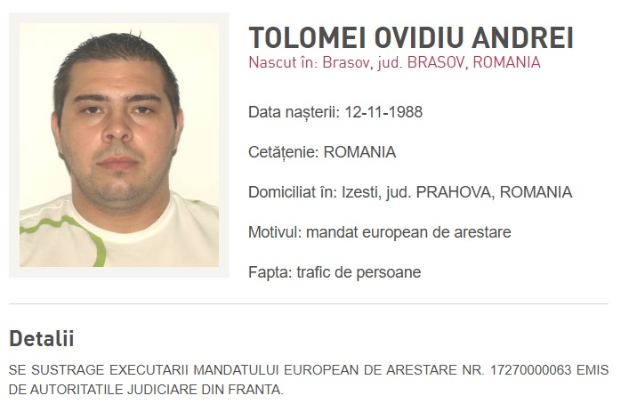 Anchetatorii au mai descoperit că unul dintre inculpați, Ovidiu Andrei Tolomei (foto sus) a fost condamnat în 2008 la 8 ani închisoare pentru omor cu premeditare, fiind eliberat condiționat în 2013. Potrivit Poliției Române, bărbatul este dat în urmărire după ce pe numele său a fost emis de către autoritățile franceze un mandat european de arestare pentru trafic de persoane.