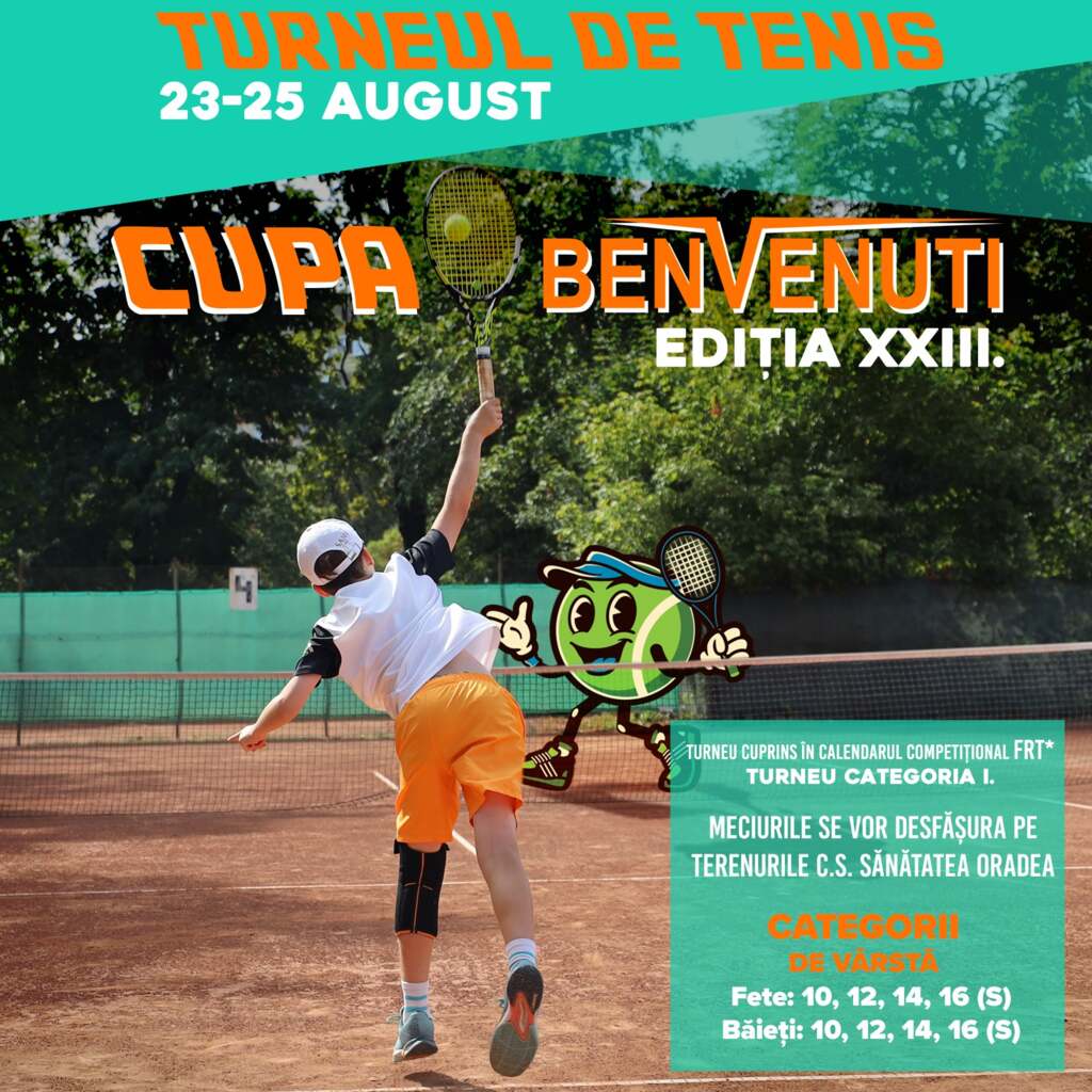 Editia a 23 a a turneului de tenis Cupa Benvenuti se va desfasura între 23 şi 25 august, pe terenurile CS Sănătatea Oradea. Str Magnoliei nr 2.