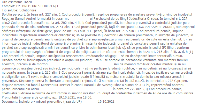 Față de acesta s-a luat măsura controlului judiciar pentru o perioadă de 60 de zile.