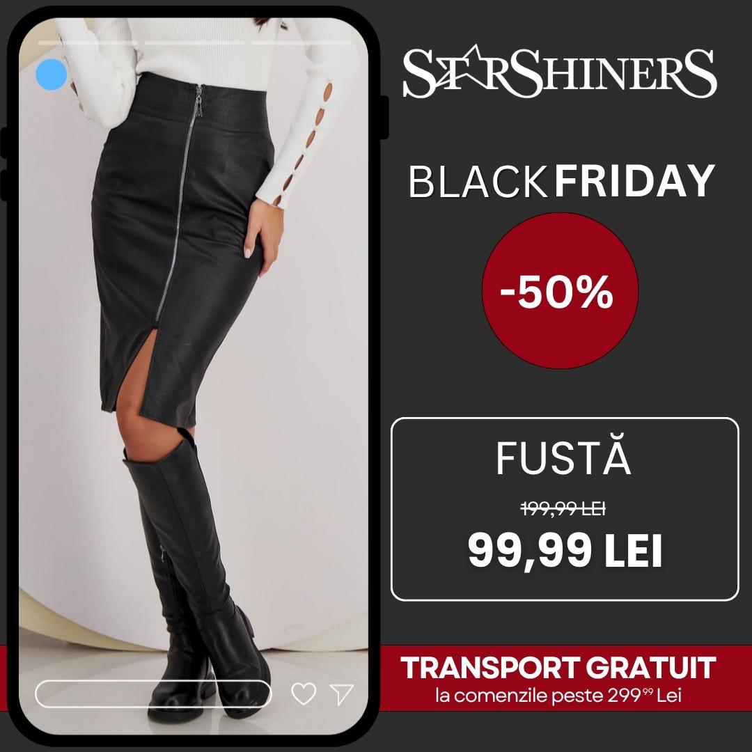 Pregătește-ți garderoba pentru sezonul rece și bucură-te de cele mai dorite reduceri de Black Friday la StarShinerS! Alege bluze moderne, de la doar 79 lei, blugi confortabili la doar 129 lei, fuste elegante începând cu 99 lei, colanți comozi și versatili, de la 89 lei, rochii de la 179 lei, și geci călduroase reduse de la 429 lei la 259 lei. Redescoperă plăcerea de a te îmbrăca frumos în fiecare zi, la prețuri de BLACK FRIDAY!