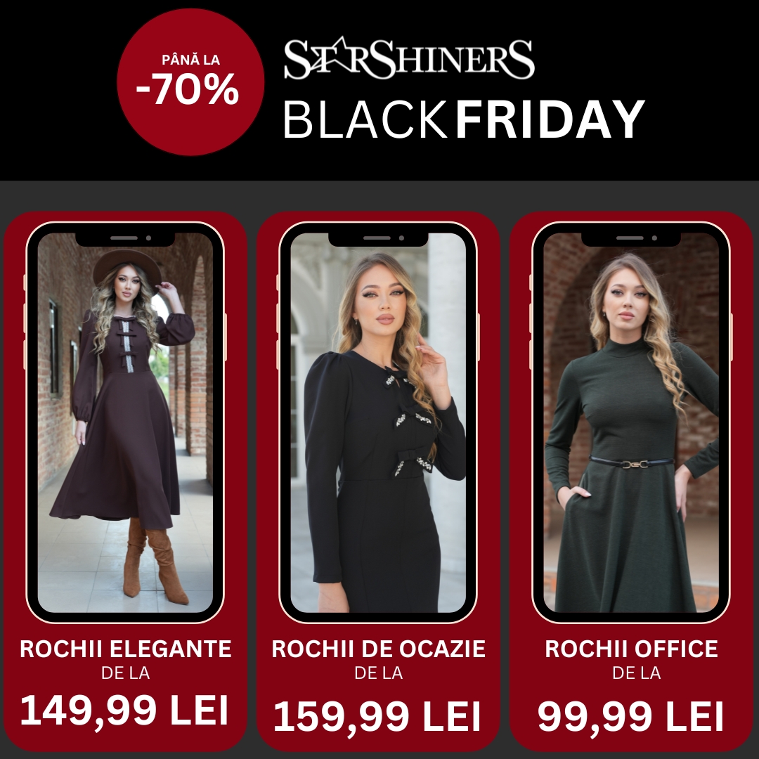Pregătește-ți garderoba pentru sezonul rece și bucură-te de cele mai dorite reduceri de Black Friday la StarShinerS! Alege bluze moderne, de la doar 79 lei, blugi confortabili la doar 129 lei, fuste elegante începând cu 99 lei, colanți comozi și versatili, de la 89 lei, rochii de la 179 lei, și geci călduroase reduse de la 429 lei la 259 lei. Redescoperă plăcerea de a te îmbrăca frumos în fiecare zi, la prețuri de BLACK FRIDAY!