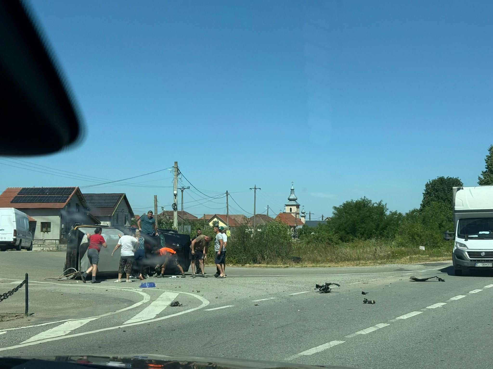 În eveniment au fost implicate două autoturisme. În urma impactului, unul dintre vehicule s-a răsturnat pe o parte, rămânând imobilizat pe carosabil.