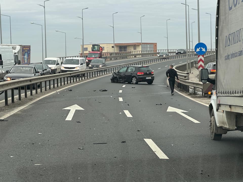 Una dintre mașinile implicate în accident este grav avariată și blochează urmarea peste pasarelă, din acest motiv oamenii legii au deviat traficul pe o rută alternativă, în același timp fiind și dirijată.