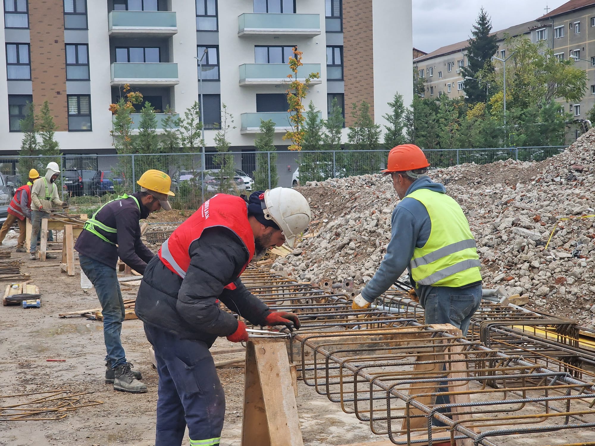 Pe șantier, muncitorii lucrează la pregătirea structurilor de fier beton ale stâlpilor viitorului bloc. Echipa de muncitori străini, din Egipt, a ajuns la lucrarea din Oradea în urmă cu aproximativ două săptămâni.