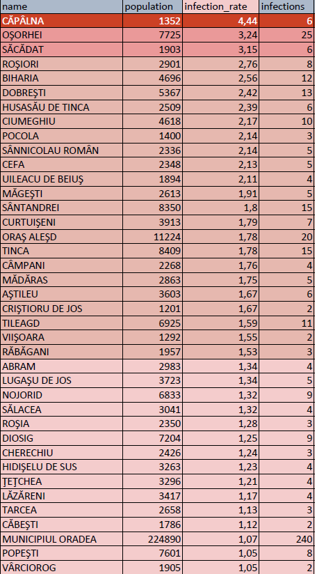 Comuna Căpâlna conduce în continuare topul incidenței COVID, cu doar 6 cazuri active la o populație de 1.353 locuitori, având rata de infectare de 4.44‰. Alte două localități care depășesc pragul de 3‰ sunt Oșorhei (3.24‰) și Săcădat (3.15‰). Incidența municipiului Oradea a scăzut cu 0.01‰ și a ajuns la 1.07‰.