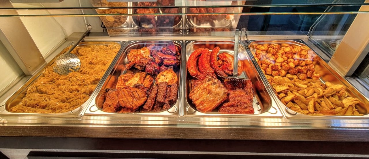 Aici găsiți delicioasa Pleșkavița bănățeană, micii XXL, coastele de porc, cârnații de casă, ciolanul de porc, ceafa de porc, pieptul de pui și multe alte produse proaspăt preparate la grătar.