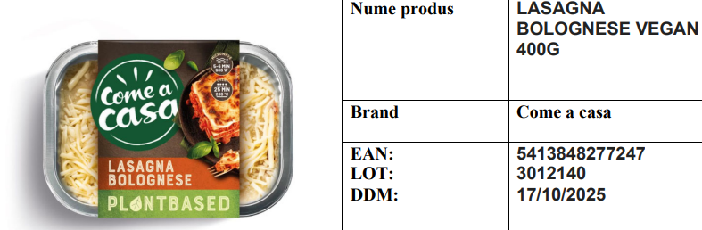 Este vorba despre Lasagna Bolognese Vegan, 400 g, marca Come a Casa, produsă de La Castellane Distribution SRL, lotul 5413848277247 3012140, cu data de expirare 17 octombrie 2025.