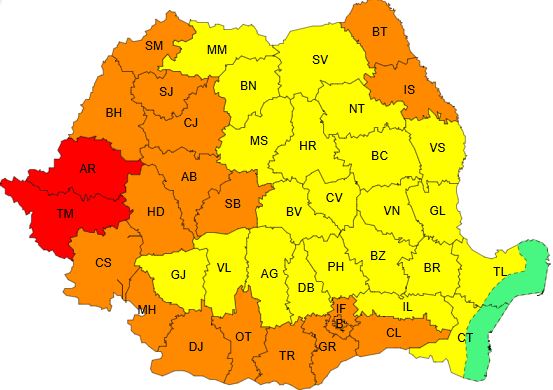 Pe parcursul zilei de marţi, judeţele Timiş şi Arad vor rămâne sub avertizare Cod roşu de caniculă, cu valori termice pe timpul zilei de 38 de grade, respectiv minime de la 18 la 23 de grade.