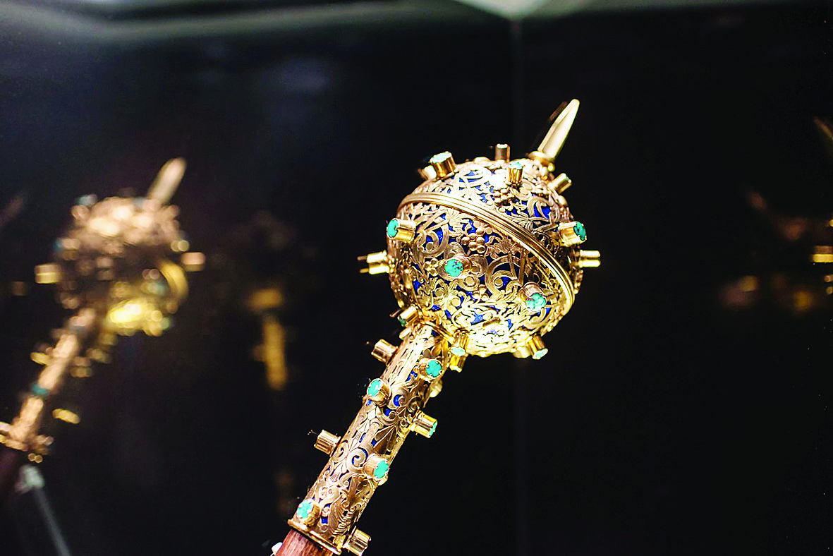 În vârful cupolei se află o coroană mică din frunze de aur, decorată tot cu perle, cu o piatră de smarald în mijloc. După moartea lui Bocskai, coroana a fost dusă la Viena de către palatinul György Thurzó, în anul 1610. Coroana originală poate fi văzută în expoziția permanentă la Kunsthistorisches Museum din Viena. Pe lângă coroană, una dintre însemnele regale ale principelui Bocskai este și sceptrul. Capul sceptrului este din argint aurit, împodobit cu motive vegetale, sub care se află o sferă acoperită cu email albastru. Mânerul este înconjurat de trei bretele largi de argint aurit. Bretelele și capul sunt împodobite cu 60 de turcoaze. Probabil că și sceptrul i-a fost dat lui Bocskai de către turci.