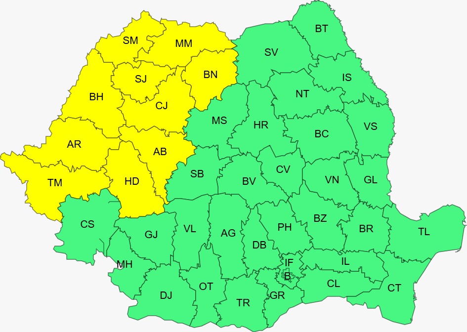 Codul galben de vreme deosebit de caldă va afecta județele: Alba, Arad, Bihor, Bistrița-Năsăud, Cluj, Hunedoara, Maramureș, Sălaj, Satu Mare și Timiș.