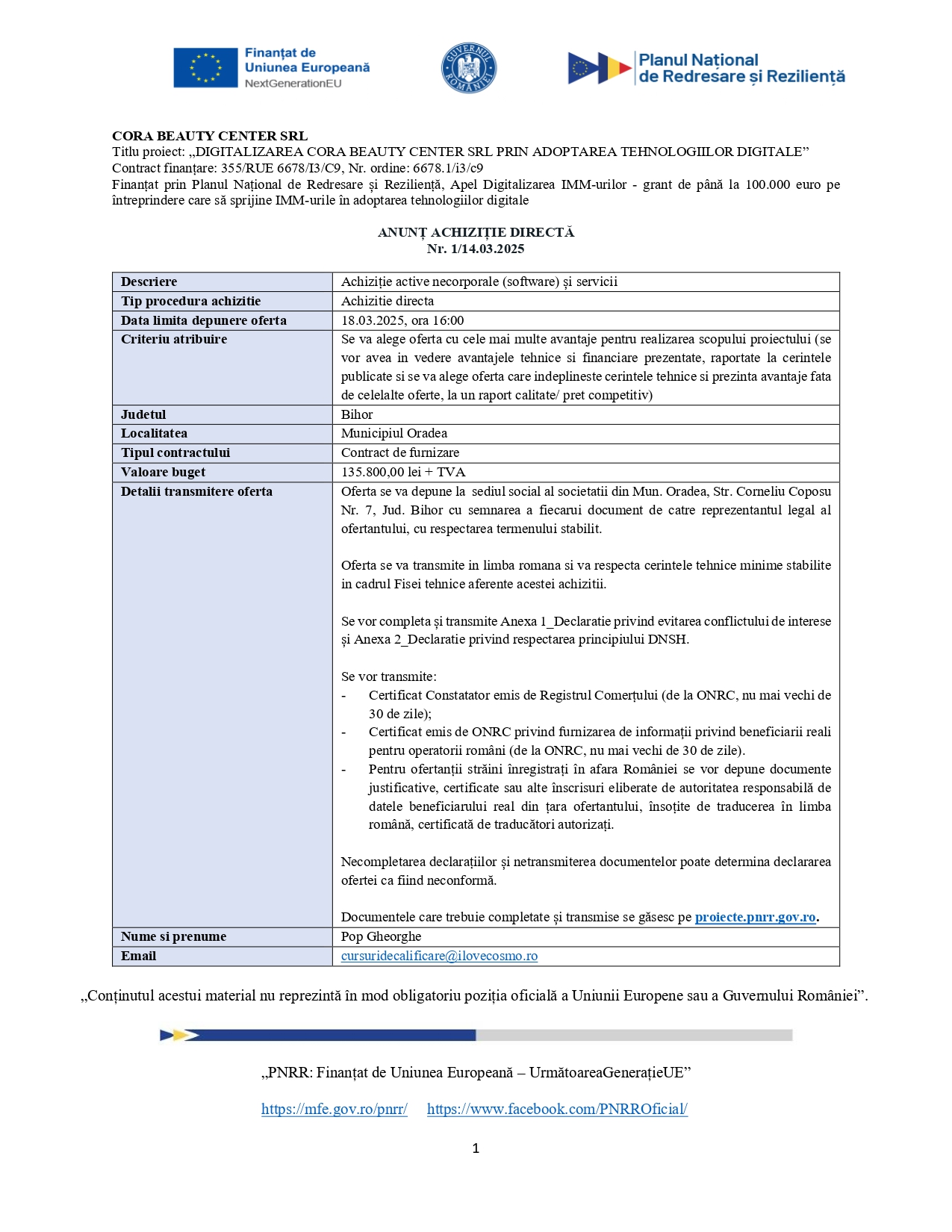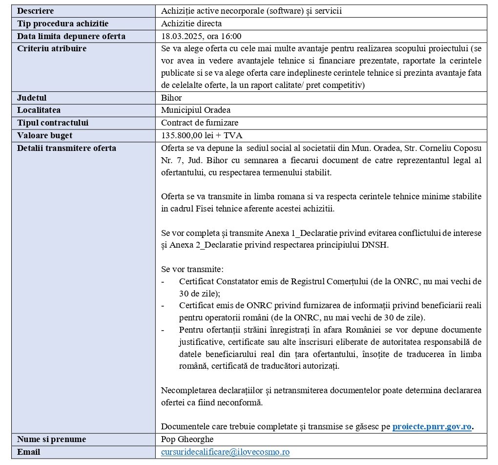 ANUNȚ ACHIZIȚIE DIRECTĂ