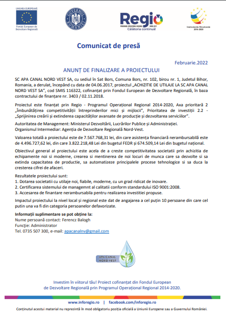 Proiectul este finanțat prin Regio – Programul Operațional Regional 2014-2020, Axa prioritară 2 „Îmbunătățirea competitivității întreprinderilor mici și mijlocii”, Prioritatea de investiții 2.2 – „Sprijinirea creării și extinderea capacităților avansate de producție și dezvoltarea serviciilor”.