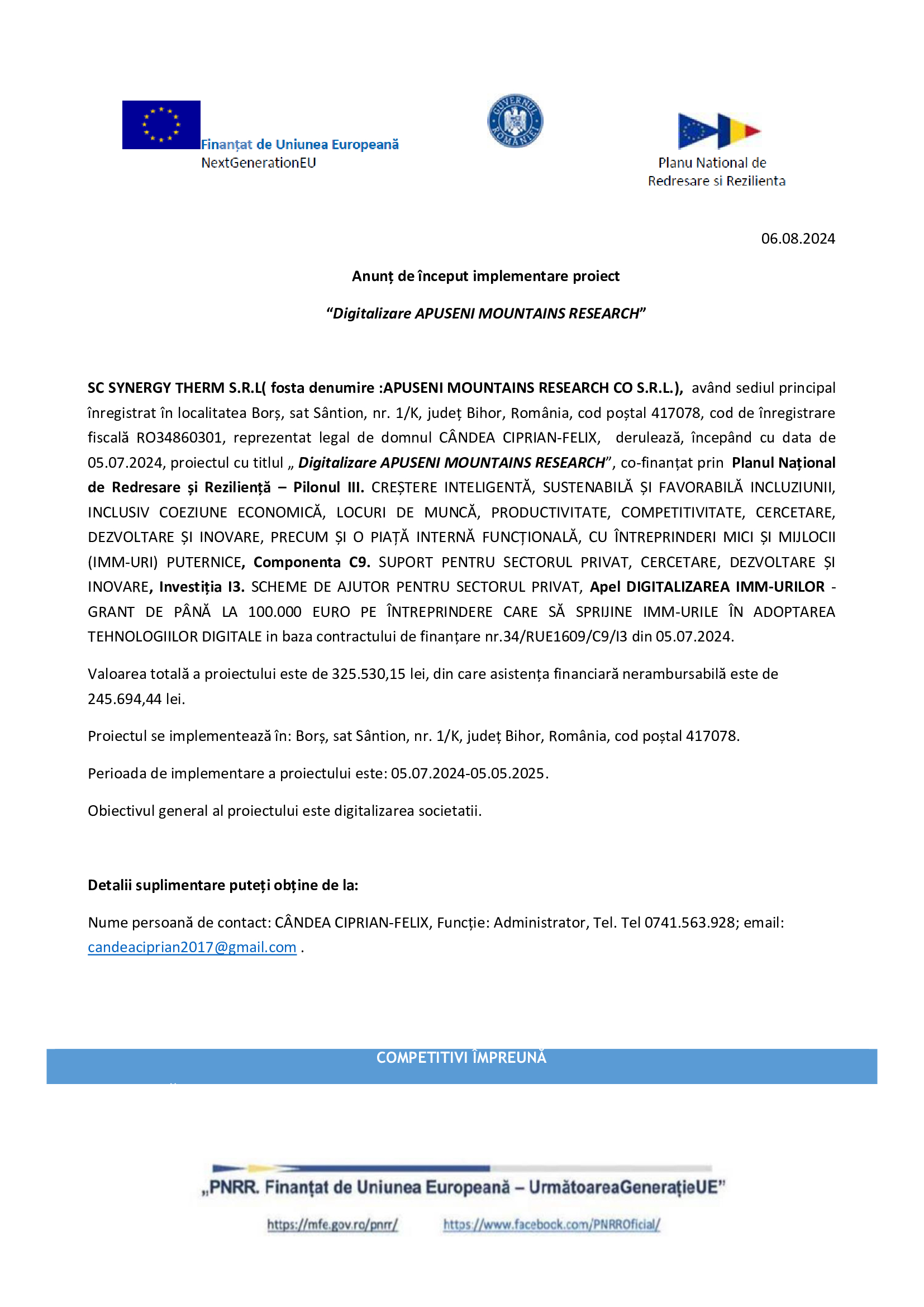 SC SYNERGY THERM S.R.L. ( fosta denumire : APUSENI MOUNTAINS RESEARCH CO S.R.L.), având sediul principal înregistrat în localitatea Borș, sat Sântion, nr. 1/K, județ Bihor, România, cod poștal 417078, cod de înregistrare fiscală RO34860301, reprezentat legal de domnul CÂNDEA CIPRIAN-FELIX, derulează, începând cu data de 05.07.2024, proiectul cu titlul „ Digitalizare APUSENI MOUNTAINS RESEARCH”, co-finanțat prin Planul Național de Redresare și Reziliență – Pilonul III. CREȘTERE INTELIGENTĂ, SUSTENABILĂ ȘI FAVORABILĂ INCLUZIUNII, INCLUSIV COEZIUNE ECONOMICĂ, LOCURI DE MUNCĂ, PRODUCTIVITATE, COMPETITIVITATE, CERCETARE, DEZVOLTARE ȘI INOVARE, PRECUM ȘI O PIAȚĂ INTERNĂ FUNCȚIONALĂ, CU ÎNTREPRINDERI MICI ȘI MIJLOCII (IMM-URI) PUTERNICE, Componenta C9. SUPORT PENTRU SECTORUL PRIVAT, CERCETARE, DEZVOLTARE ȘI INOVARE, Investiția I3. SCHEME DE AJUTOR PENTRU SECTORUL PRIVAT, Apel DIGITALIZAREA IMM-URILOR – GRANT DE PÂNĂ LA 100.000 EURO PE ÎNTREPRINDERE CARE SĂ SPRIJINE IMM-URILE ÎN ADOPTAREA TEHNOLOGIILOR DIGITALE in baza contractului de finanțare nr.34/RUE1609/C9/I3 din 05.07.2024. Valoarea totală a proiectului este de 325.530,15 lei, din care asistența financiară nerambursabilă este de 245.694,44 lei.