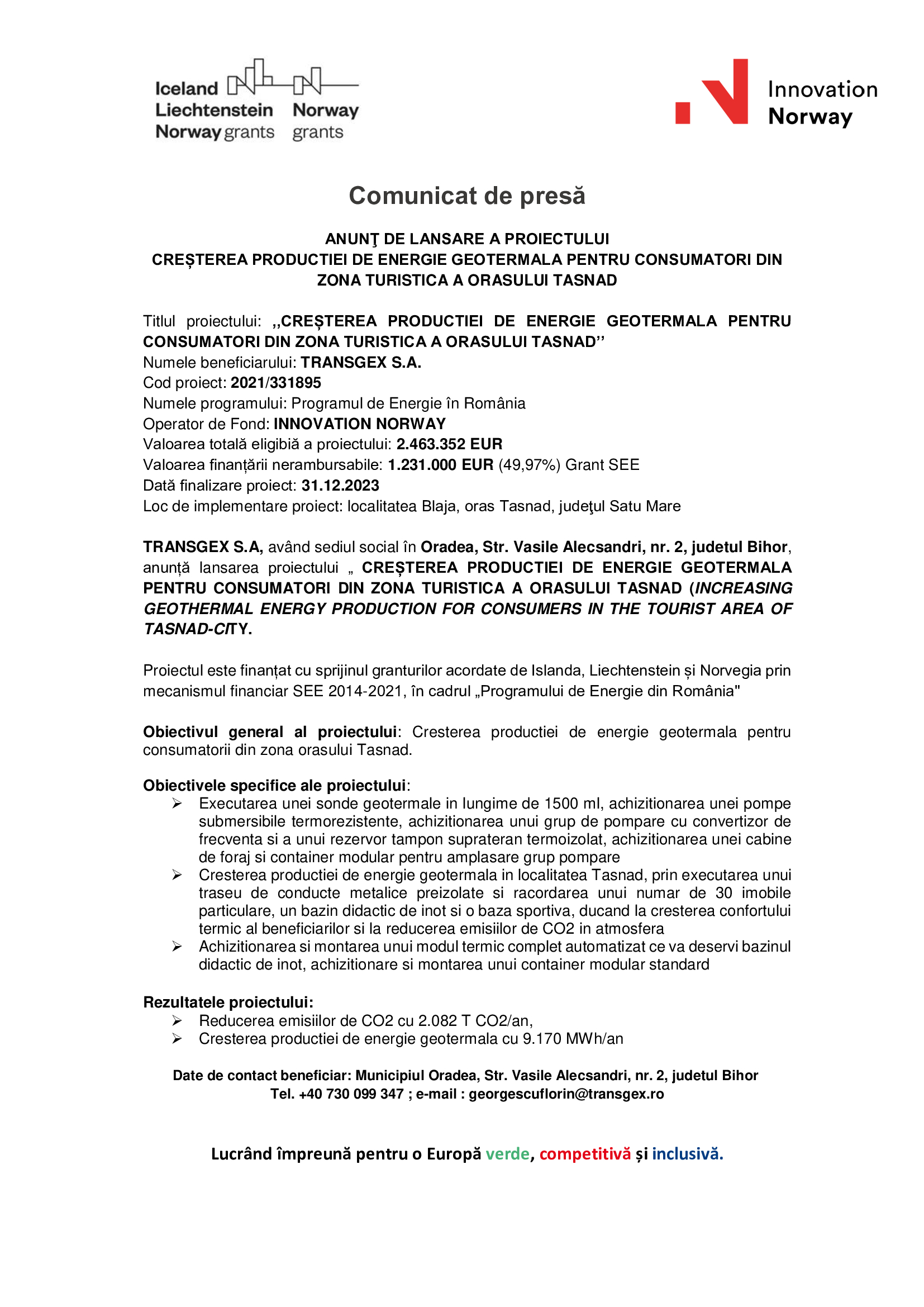TRANSGEX S.A, având sediul social în Oradea, Str. Vasile Alecsandri, nr. 2, judetul Bihor, anunță lansarea proiectului „ CREȘTEREA PRODUCTIEI DE ENERGIE GEOTERMALA PENTRU CONSUMATORI DIN ZONA TURISTICA A ORASULUI TASNAD (INCREASING GEOTHERMAL ENERGY PRODUCTION FOR CONSUMERS IN THE TOURIST AREA OF TASNAD-CITY.