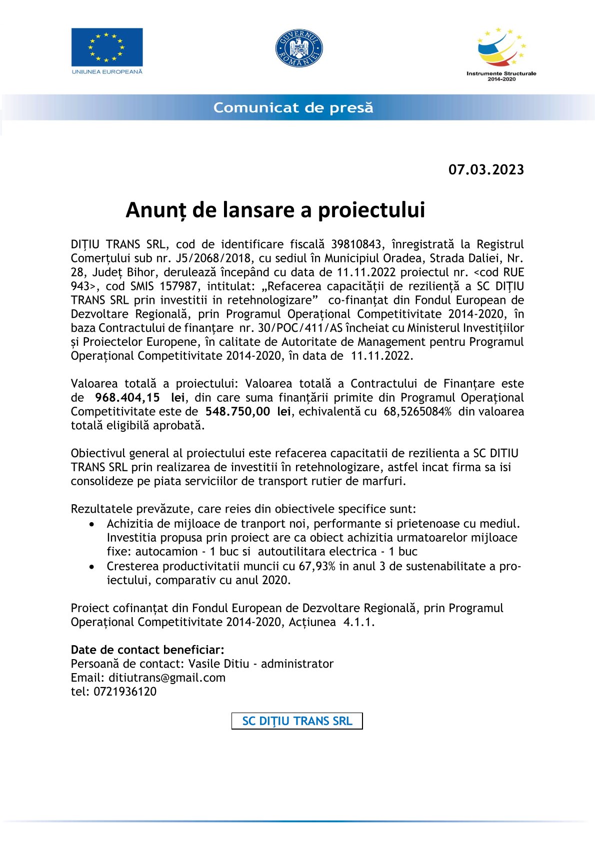DIŢIU TRANS SRL, cod de identificare fiscală 39810843, înregistrată la Registrul Comerțului sub nr. J5/2068/2018, cu sediul în Municipiul Oradea, Strada Daliei, Nr. 28, Județ Bihor, derulează începând cu data de 11.11.2022 proiectul nr. <cod RUE 943>, cod SMIS 157987, intitulat: „Refacerea capacității de reziliență a SC DIŢIU TRANS SRL prin investitii in retehnologizare” co-finanţat din Fondul European de Dezvoltare Regională, prin Programul Operațional Competitivitate 2014-2020, în baza Contractului de finanţare nr. 30/POC/411/AS încheiat cu Ministerul Investițiilor și Proiectelor Europene, în calitate de Autoritate de Management pentru Programul Operațional Competitivitate 2014-2020, în data de 11.11.2022.
