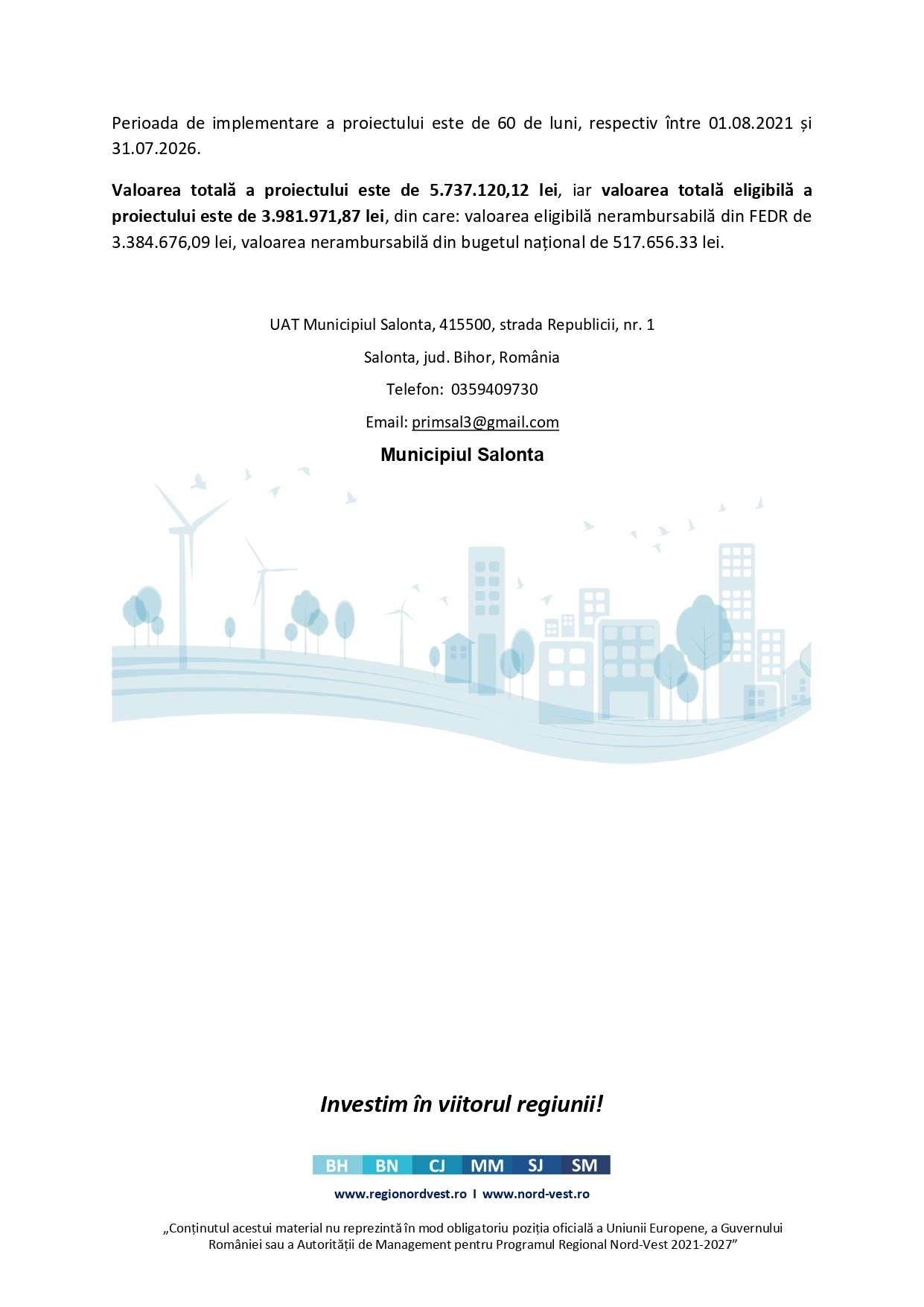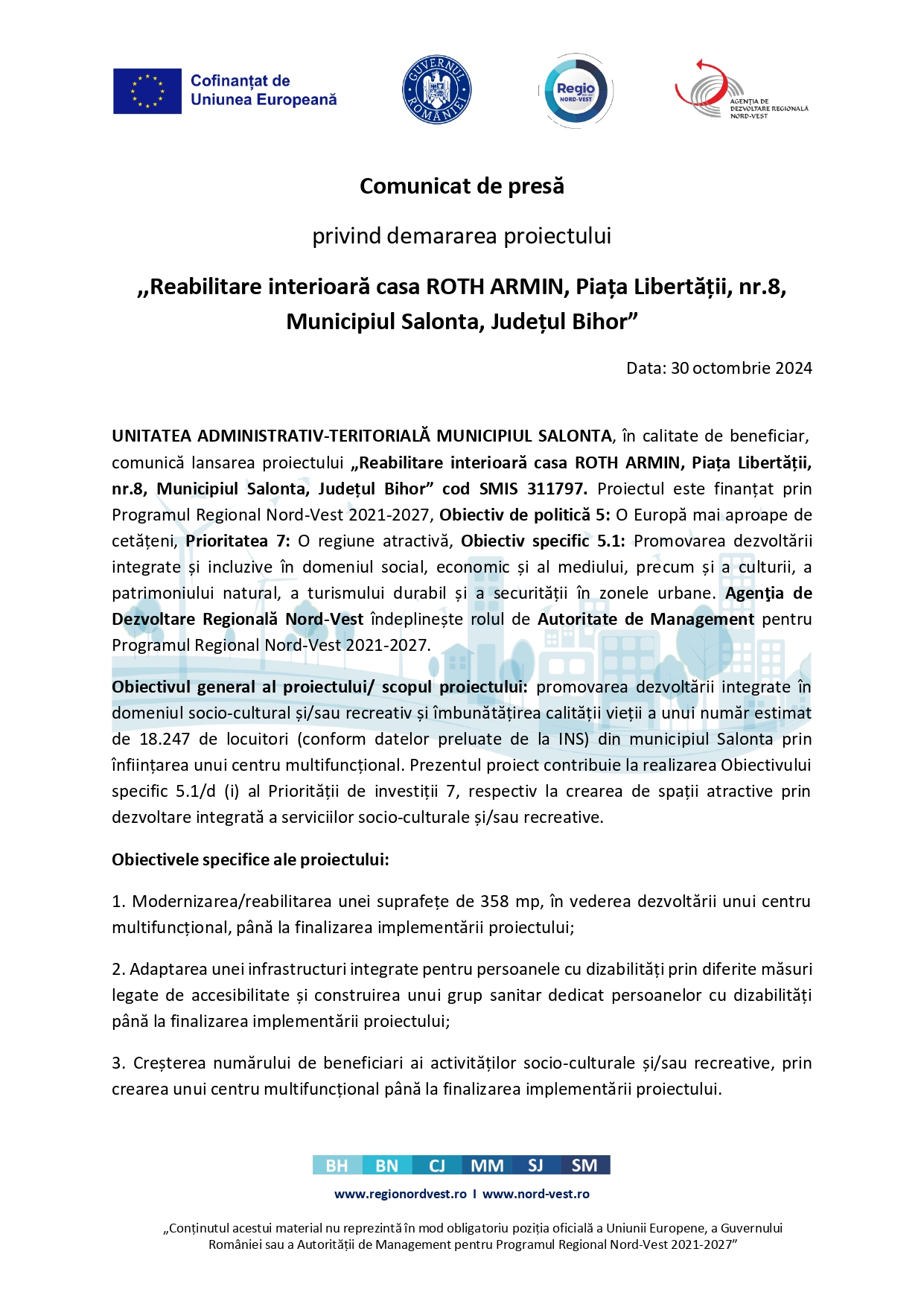 UNITATEA ADMINISTRATIV-TERITORIALĂ MUNICIPIUL SALONTA, în calitate de beneficiar, comunică lansarea proiectului „Reabilitare interioară casa ROTH ARMIN, Piața Libertății, nr.8, Municipiul Salonta, Județul Bihor” cod SMIS 311797. Proiectul este finanțat prin Programul Regional Nord-Vest 2021-2027, Obiectiv de politică 5: O Europă mai aproape de cetățeni, Prioritatea 7: O regiune atractivă, Obiectiv specific 5.1: Promovarea dezvoltării integrate și incluzive în domeniul social, economic și al mediului, precum și a culturii, a patrimoniului natural, a turismului durabil și a securității în zonele urbane. Agenţia de Dezvoltare Regională Nord-Vest îndeplinește rolul de Autoritate de Management pentru Programul Regional Nord-Vest 2021-2027.