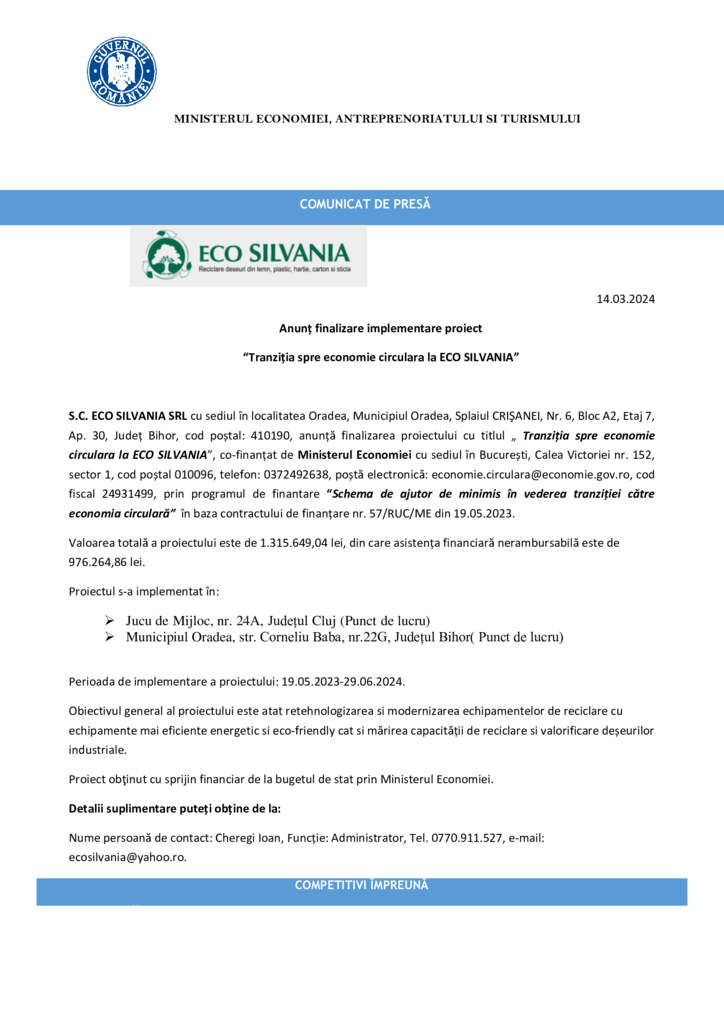 S.C. ECO SILVANIA SRL cu sediul în localitatea Oradea, Municipiul Oradea, Splaiul CRIŞANEI, Nr. 6, Bloc A2, Etaj 7, Ap. 30, Județ Bihor, cod poștal: 410190, anunță finalizarea proiectului cu titlul „ Tranziția spre economie circulara la ECO SILVANIA”, co-finanțat de Ministerul Economiei cu sediul în București, Calea Victoriei nr. 152, sector 1, cod poștal 010096, telefon: 0372492638, poștă electronică: economie.circulara@economie.gov.ro, cod fiscal 24931499, prin programul de finantare “Schema de ajutor de minimis în vederea tranziției către economia circulară” în baza contractului de finanțare nr. 57/RUC/ME din 19.05.2023.