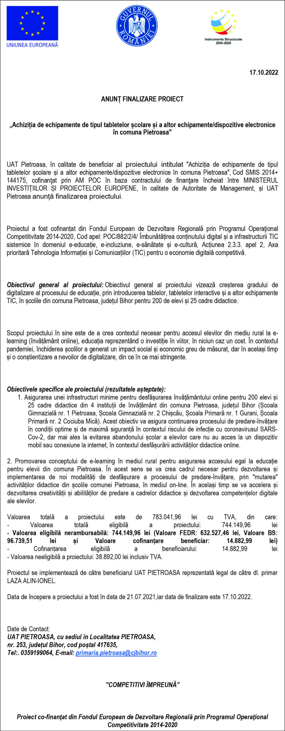 UAT Pietroasa, în calitate de beneficiar al proiectului intitulat “Achiziția de echipamente de tipul tabletelor școlare și a altor echipamente/dispozitive electronice în comuna Pietroasa”, Cod SMIS 2014+ 144175, cofinanţat prin AM POC în baza contractului de finanţare încheiat între MINISTERUL INVESTIȚIILOR ȘI PROIECTELOR EUROPENE, în calitate de Autoritate de Management, și UAT Pietroasa anunță finalizarea proiectului.