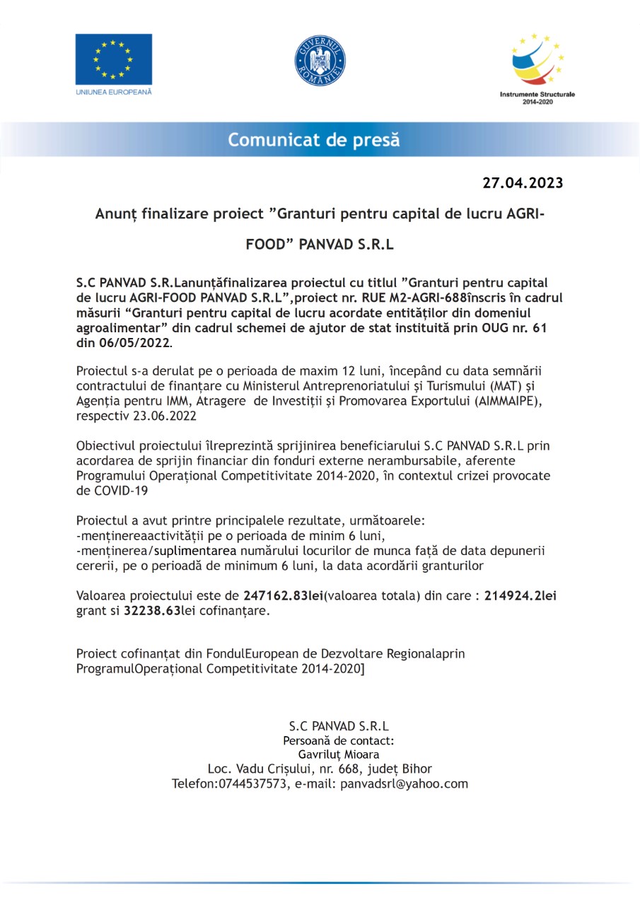 S.C PANVAD S.R.Lanunțăfinalizarea proiectul cu titlul ”Granturi pentru capital de lucru AGRI-FOOD PANVAD S.R.L”,proiect nr. RUE M2-AGRI-688înscris în cadrul măsurii “Granturi pentru capital de lucru acordate entităților din domeniul agroalimentar” din cadrul schemei de ajutor de stat instituită prin OUG nr. 61 din 06/05/2022.