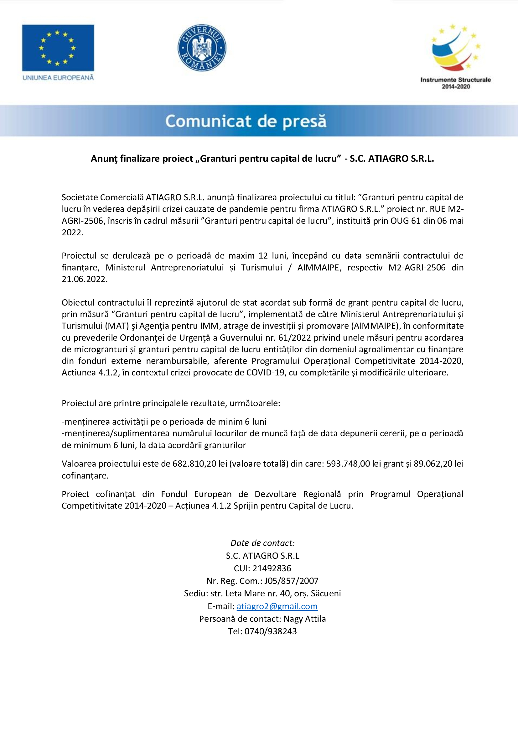 Societate Comercială ATIAGRO S.R.L. anunță finalizarea proiectului cu titlul: ”Granturi pentru capital de lucru în vederea depășirii crizei cauzate de pandemie pentru firma ATIAGRO S.R.L.” proiect nr. RUE M2-AGRI-2506, înscris în cadrul măsurii ”Granturi pentru capital de lucru”, instituită prin OUG 61 din 06 mai 2022.