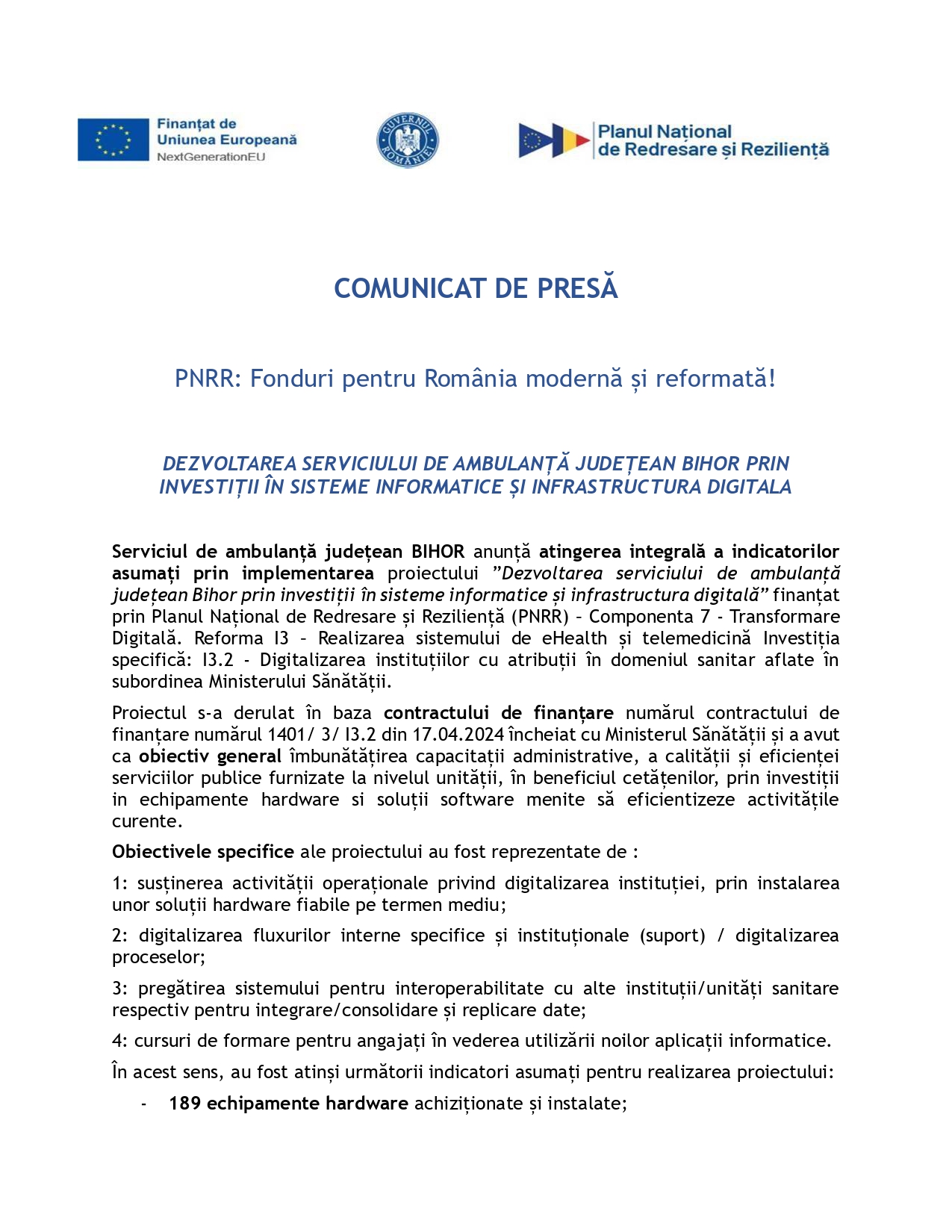 Serviciul de ambulanță județean BIHOR anunță atingerea integrală a indicatorilor asumați prin implementarea proiectului „Dezvoltarea serviciului de ambulanță județean Bihor prin investiții în sisteme informatice și infrastructura digitală” finanțat prin Planul Național de Redresare și Reziliență (PNRR) – Componenta 7 – Transformare Digitală. Reforma I3 – Realizarea sistemului de eHealth și telemedicină Investiția specifică: I3.2 – Digitalizarea instituțiilor cu atribuții în domeniul sanitar aflate în subordinea Ministerului Sănătății.