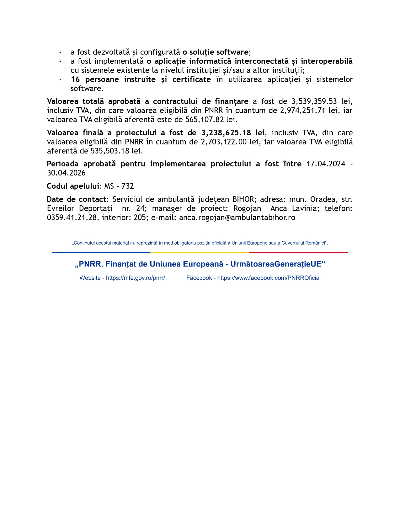 Date de contact: Serviciul de ambulanță județean BIHOR; adresa: mun. Oradea, str. Evreilor Deportați nr. 24; manager de proiect: Rogojan Anca Lavinia; telefon: 0359.41.21.28, interior: 205; e-mail: anca.rogojan@ambulantabihor.ro