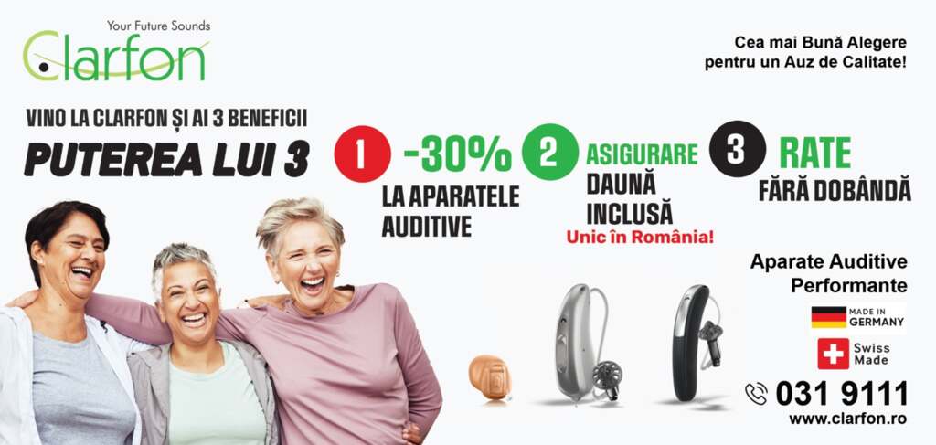 Vino în cabinetele Clarfon Oradea pentru a o testare auditivă gratuită și detalii despre aparatele auditive! În această perioadă te bucuri de 3 beneficii: 30% reducere la toate aparatele auditive, asigurarea aparatului auditiv și rate fără dobândă.